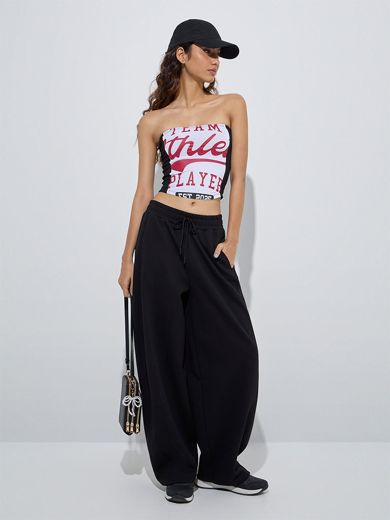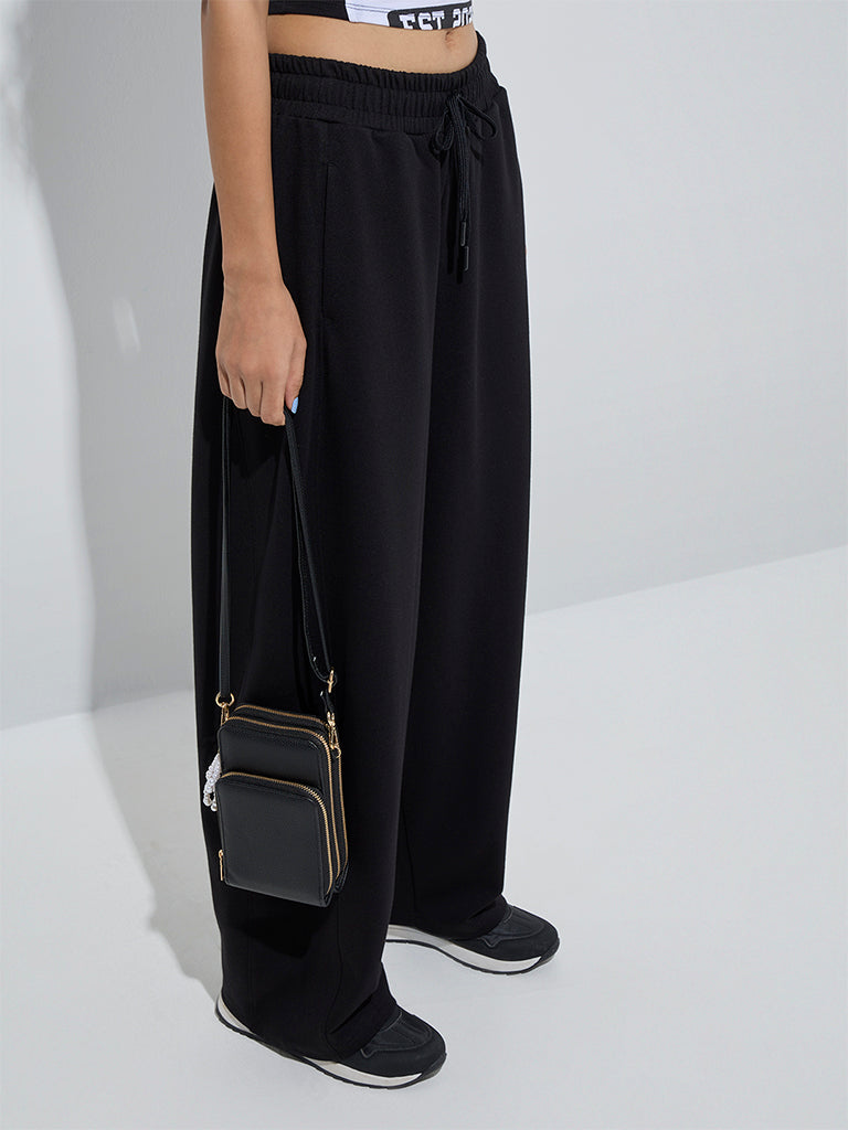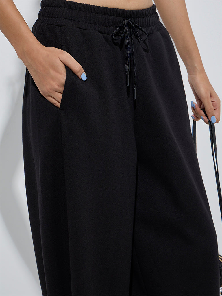 These black high-rise track pants from Studiofit are a go-to for laid-back comfort with a clean finish. Crafted from pure cotton. they feature a smooth elastic waistband. adjustable drawstrings. and functional side pockets. making them a versatile pick for relaxed. everyday dressing.