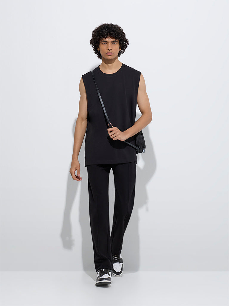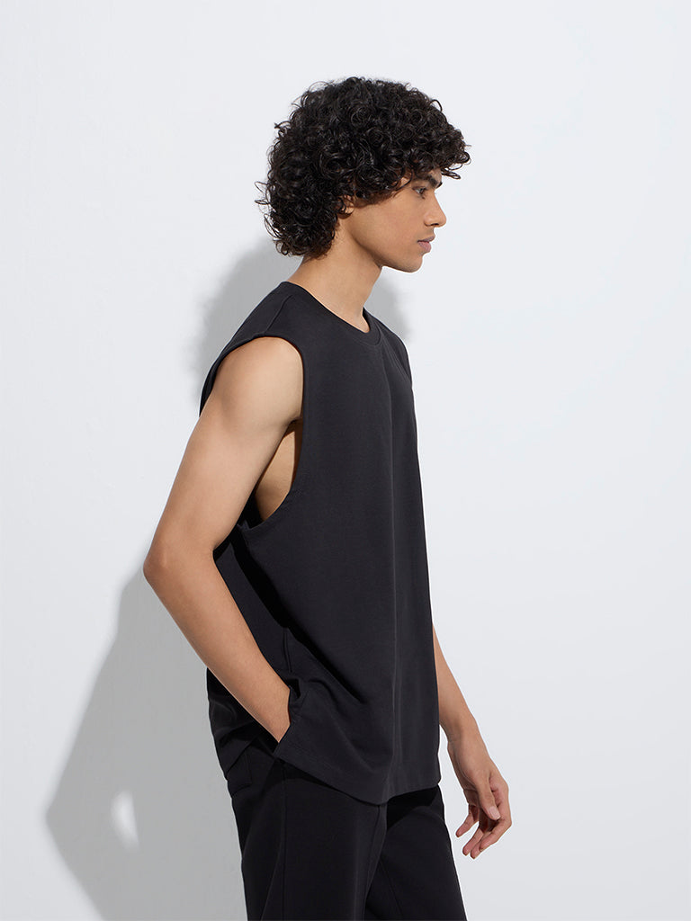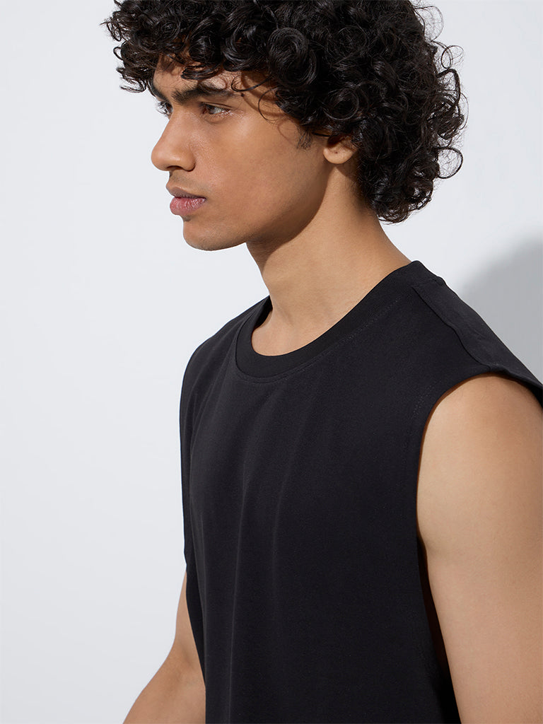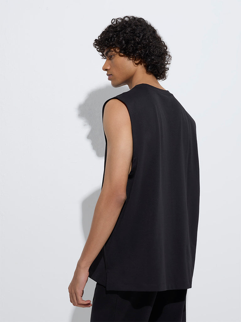 Studiofit brings you this black t-shirt designed in a relaxed fit for effortless style. Made from a rich cotton-blend fabric. it features a classic round neck and a sleeveless cut. making it a versatile pick for casual wear or gym sessions.