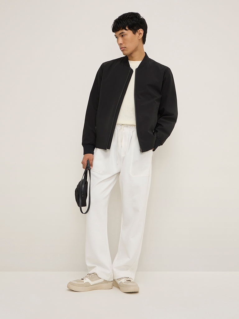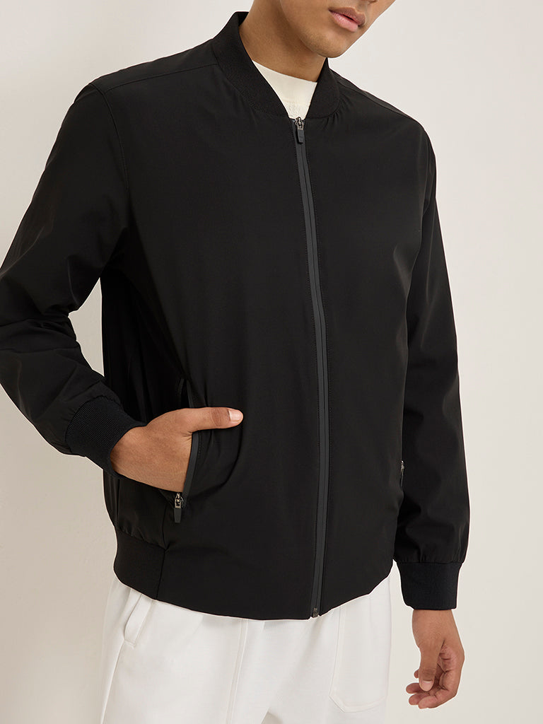 This black jacket from Studiofit is fashioned in a minimalistic profile. Built from a lightweight fabric. it includes a ribbed collar that extends to a zipper placket and full sleeves. The zipper pockets add a practical finish.