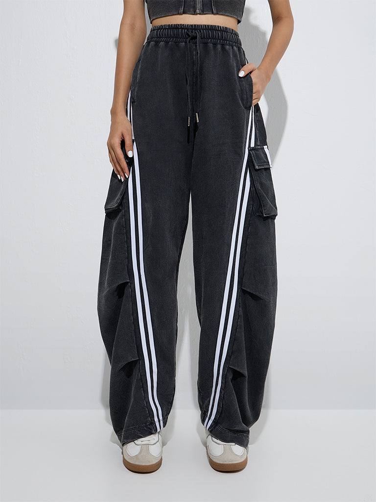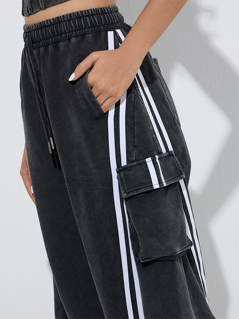 Studiofit Black Stripe Printed High-Rise Denim Track Pants