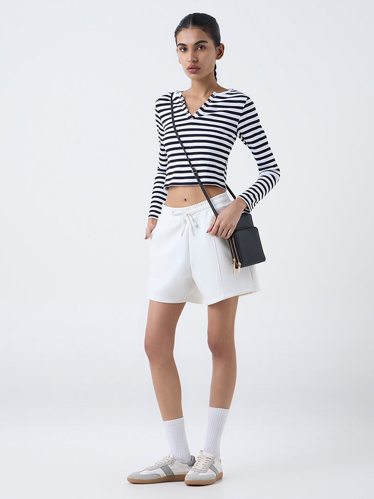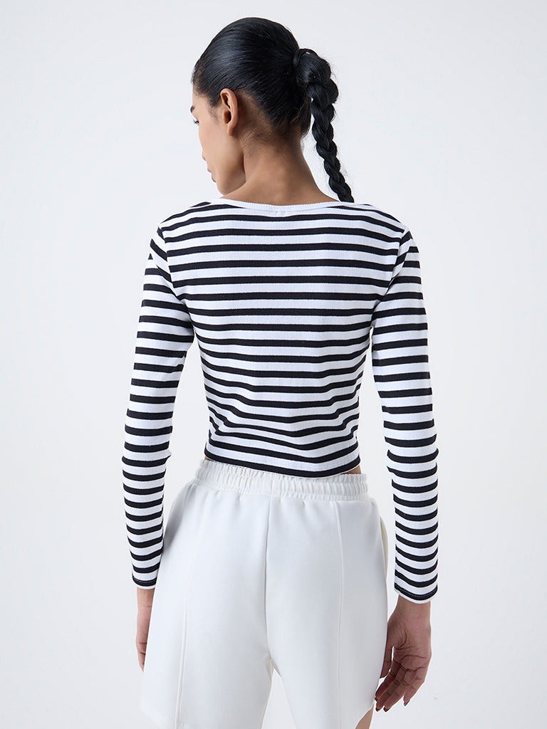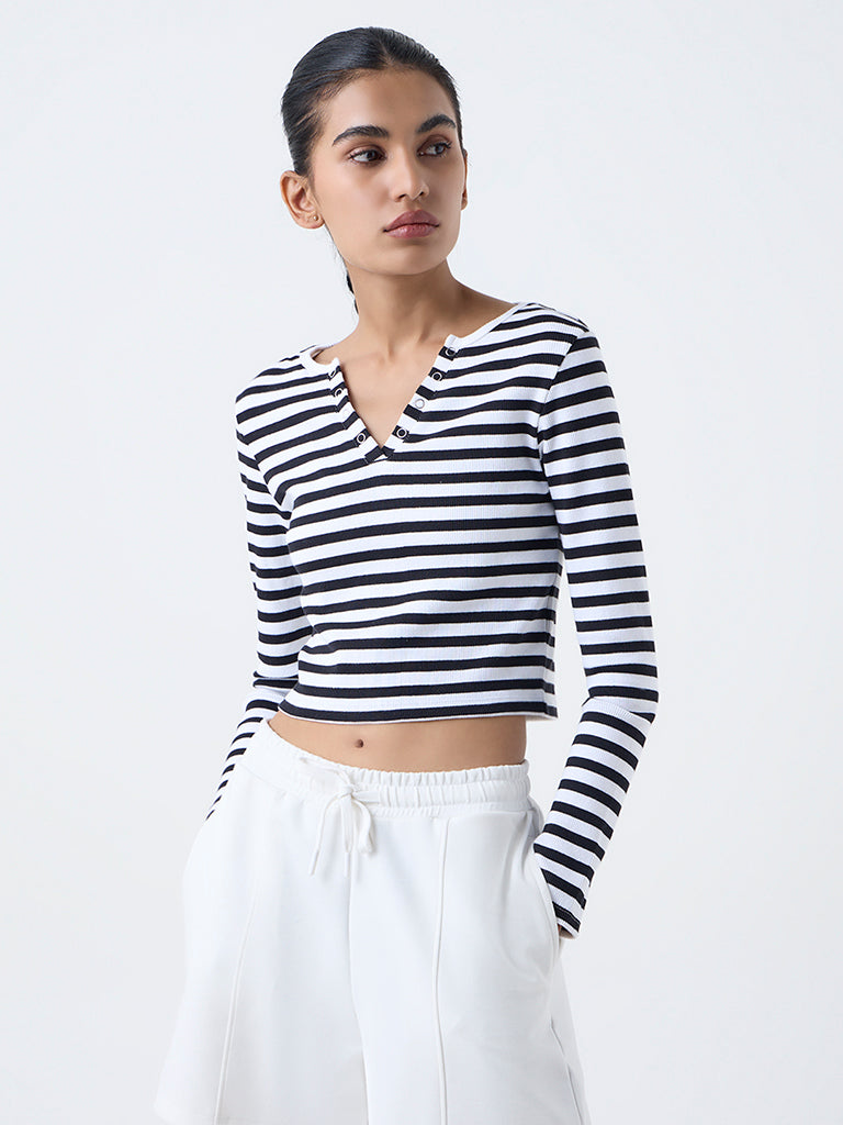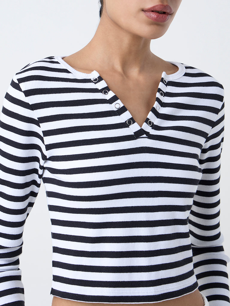 Studiofit Black Striped Cotton-Blend Henley T-Shirt