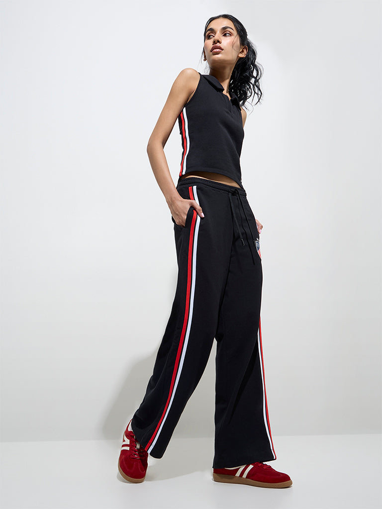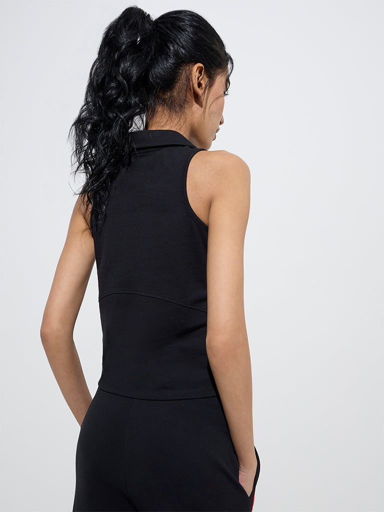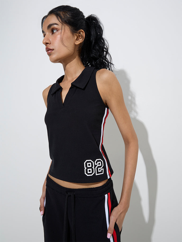 Studiofit presents this black t-shirt. featuring bold numerical detailing and striped accents for a sporty edge. Crafted from a cotton-rich blend. it offers a V-neck collar and a sleeveless design. ensuring a breathable and stylish fit.