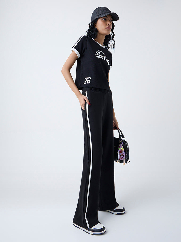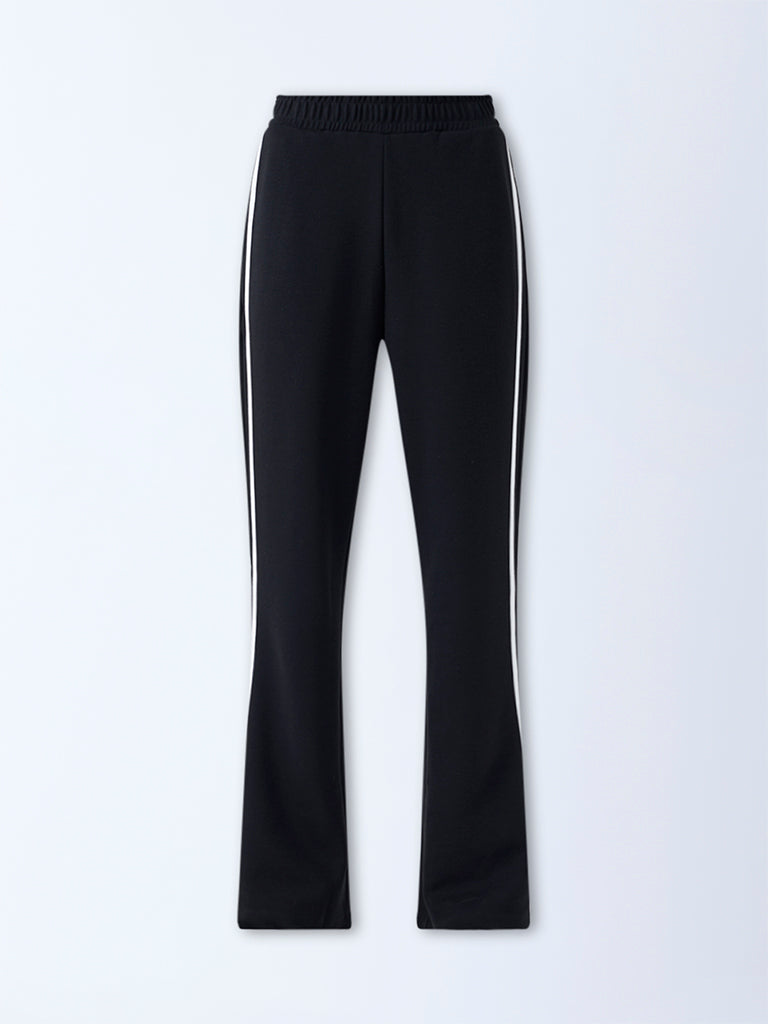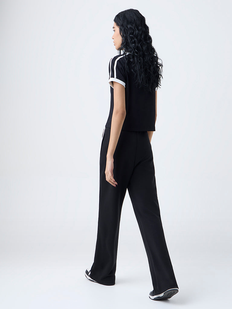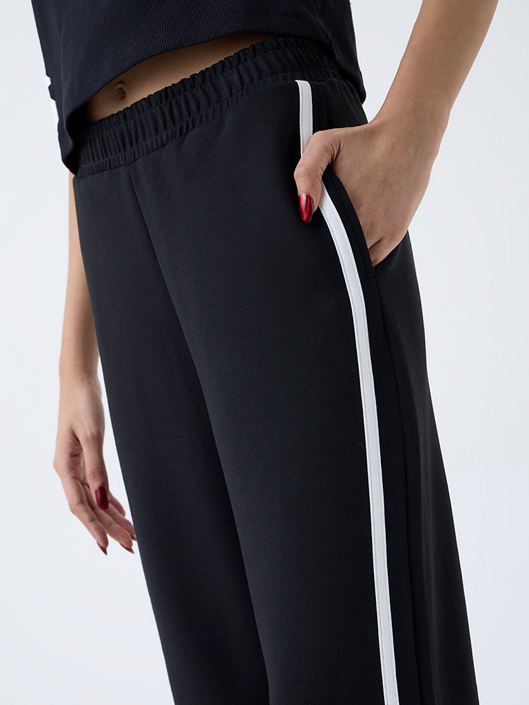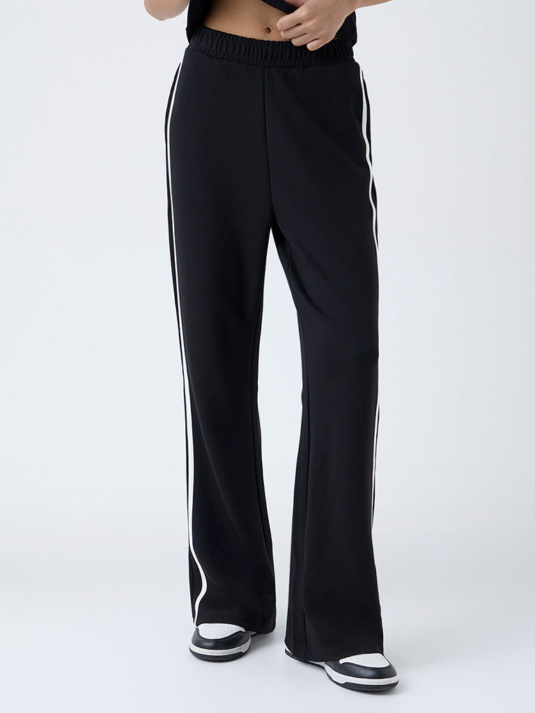 Move with ease in these black pants from Studiofit. crafted from a sumptuous. lightweight fabric blend. delivering utmost comfort. The high-rise frame is fitted with an elastic waist and side pockets for functionality. Highlighting contrast stripes on the sides. it brings a sleek. athletic finish to everyday wear.