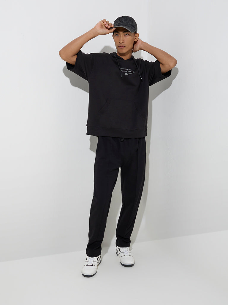 Studiofit Black Text Print Relaxed-Fit Cotton-Blend Hoodie