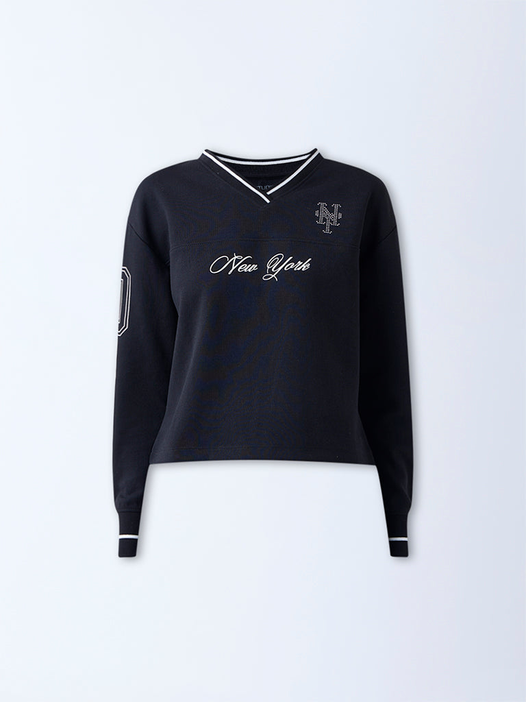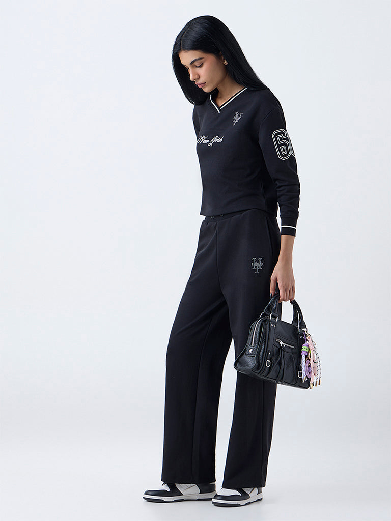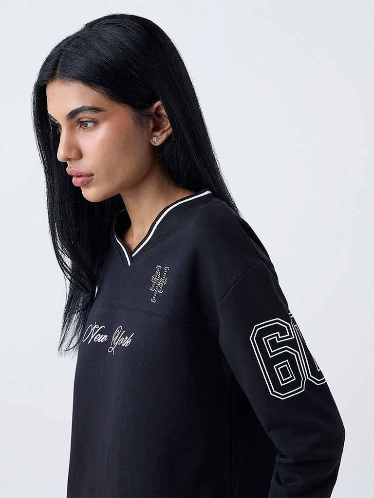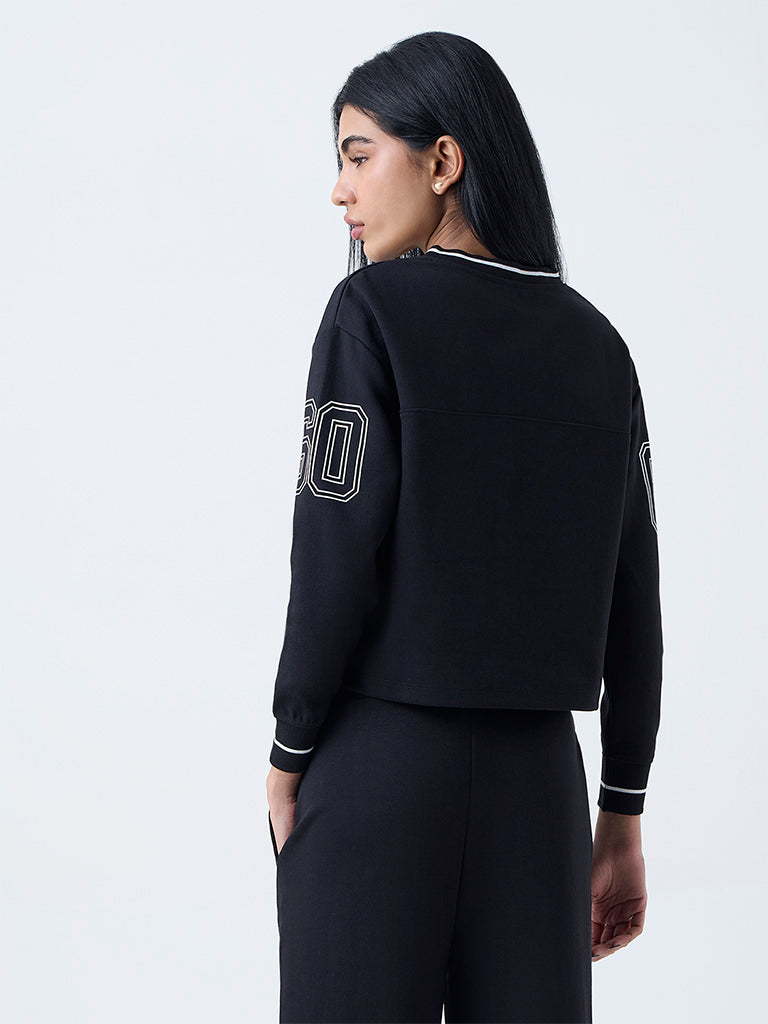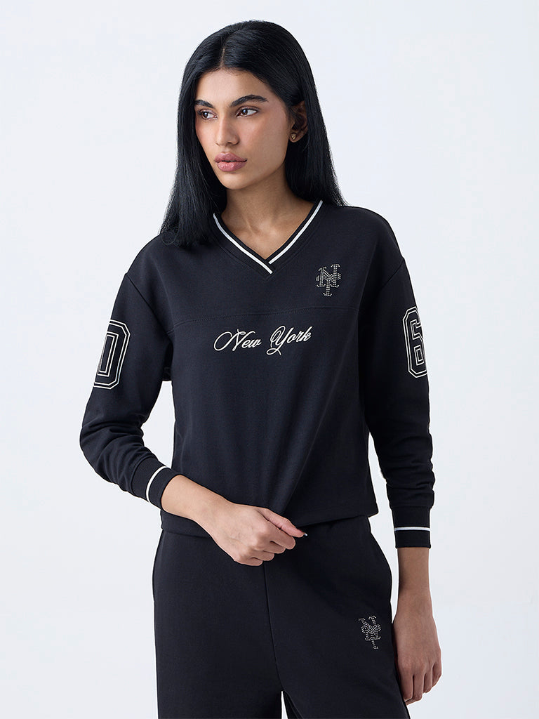 Crafted from a soft cotton-blend fabric. this black T-shirt by Studiofit features a ribbed V-neck and full sleeves. The front showcases a striking text print that adds a modern. sporty edge to casual looks.