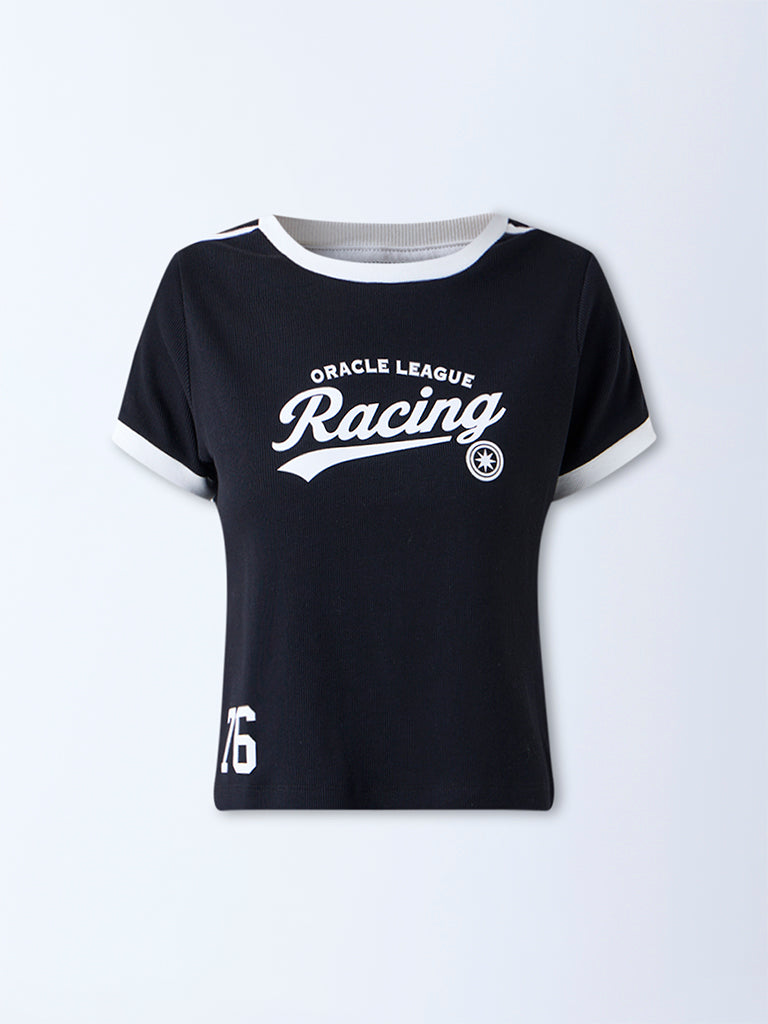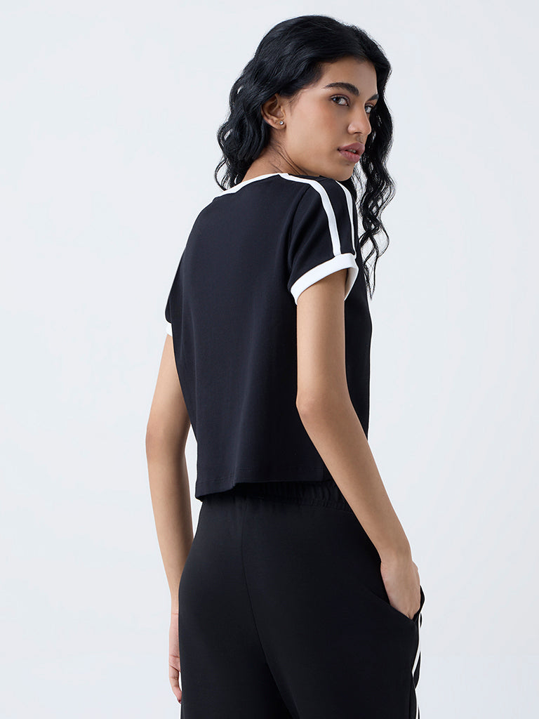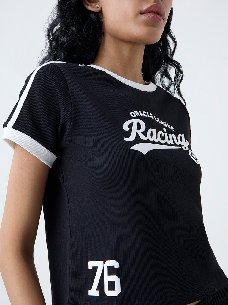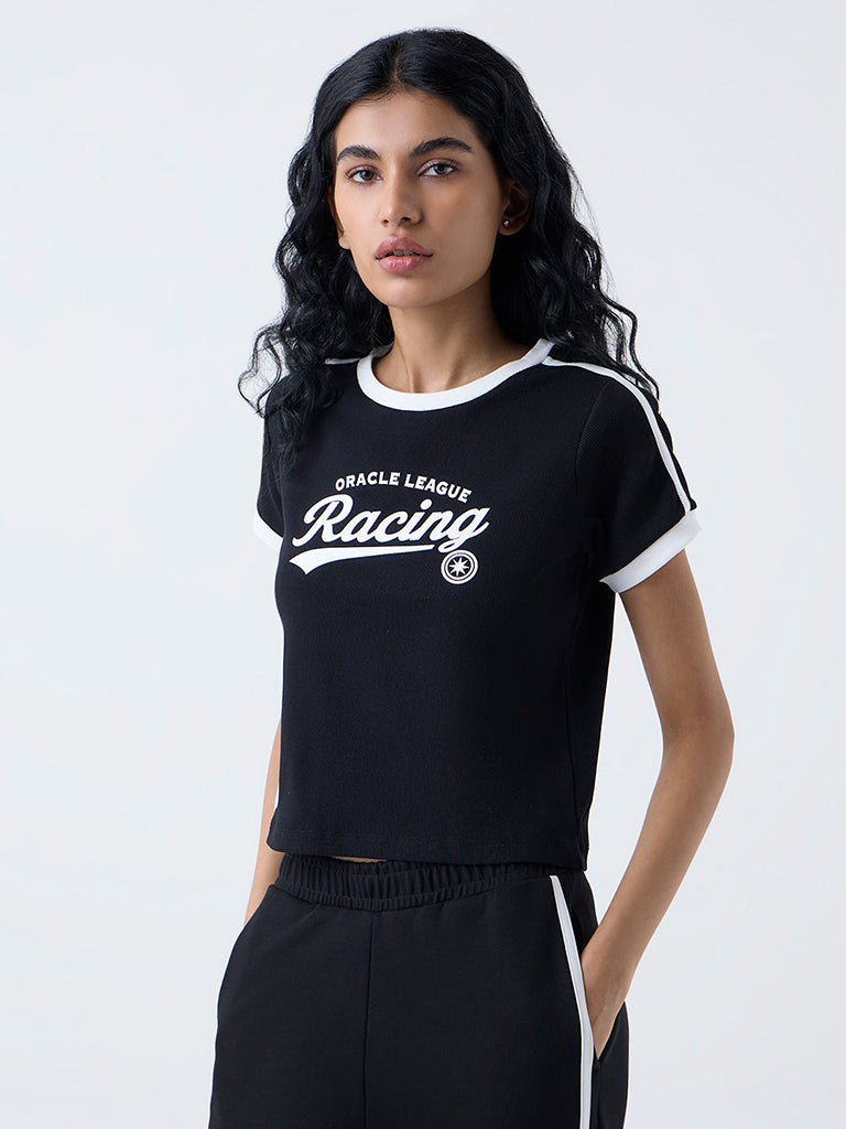 Studiofit brings this black t-shirt featuring bold. stylised text prints on a ribbed textured base. Milled from cotton-blend fabric for effortless comfort. it is finished with a round neck and short sleeves highlighting contrast stripes. Designed to pair easily with joggers or shorts. it adds a graphic edge to your activewear lineup.