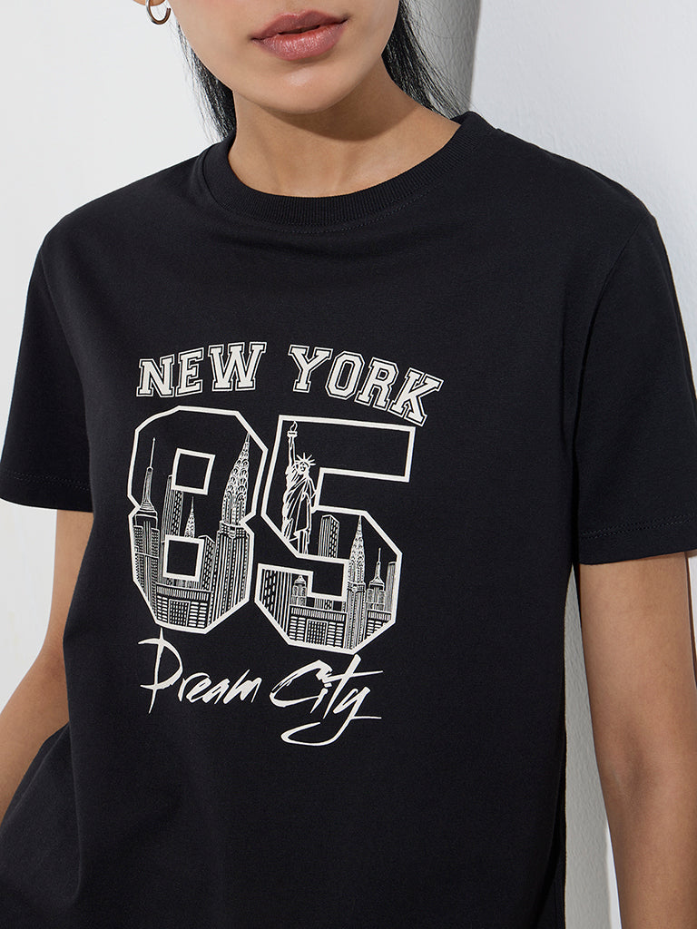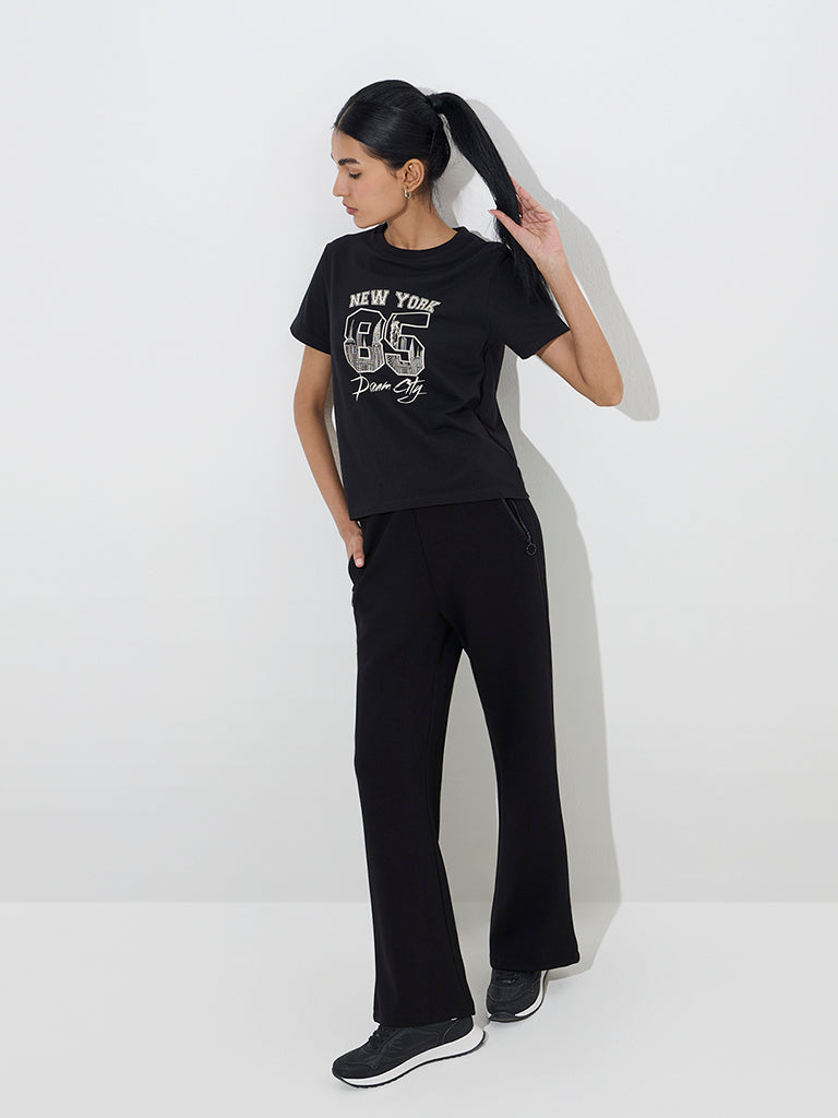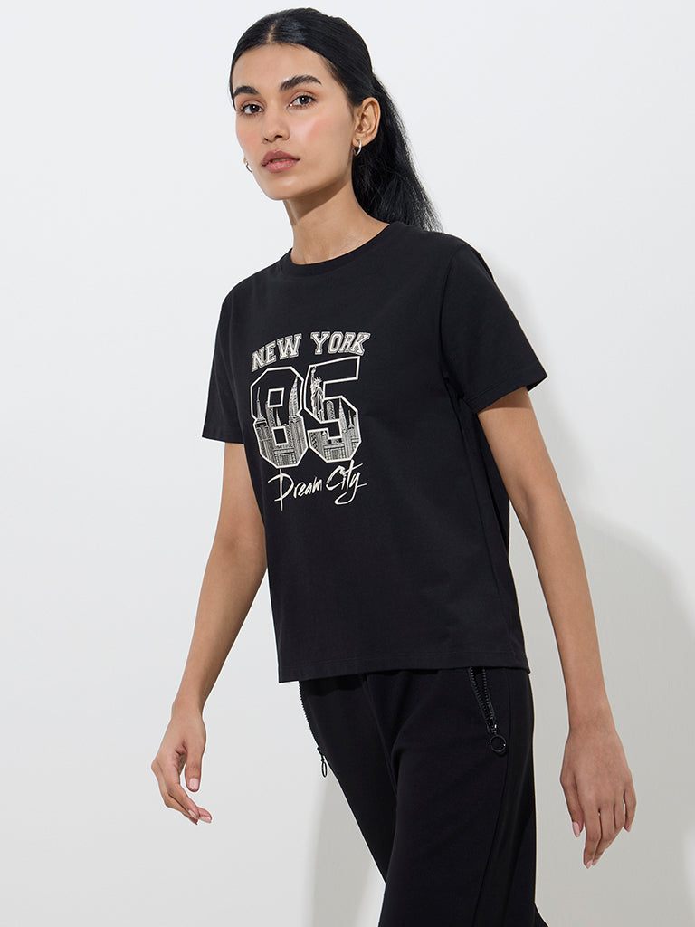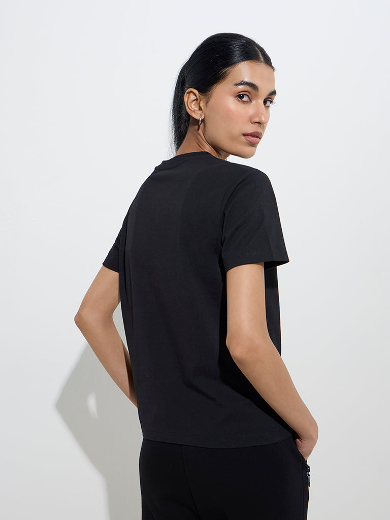 Studiofit Black Text Printed Cotton T-Shirt