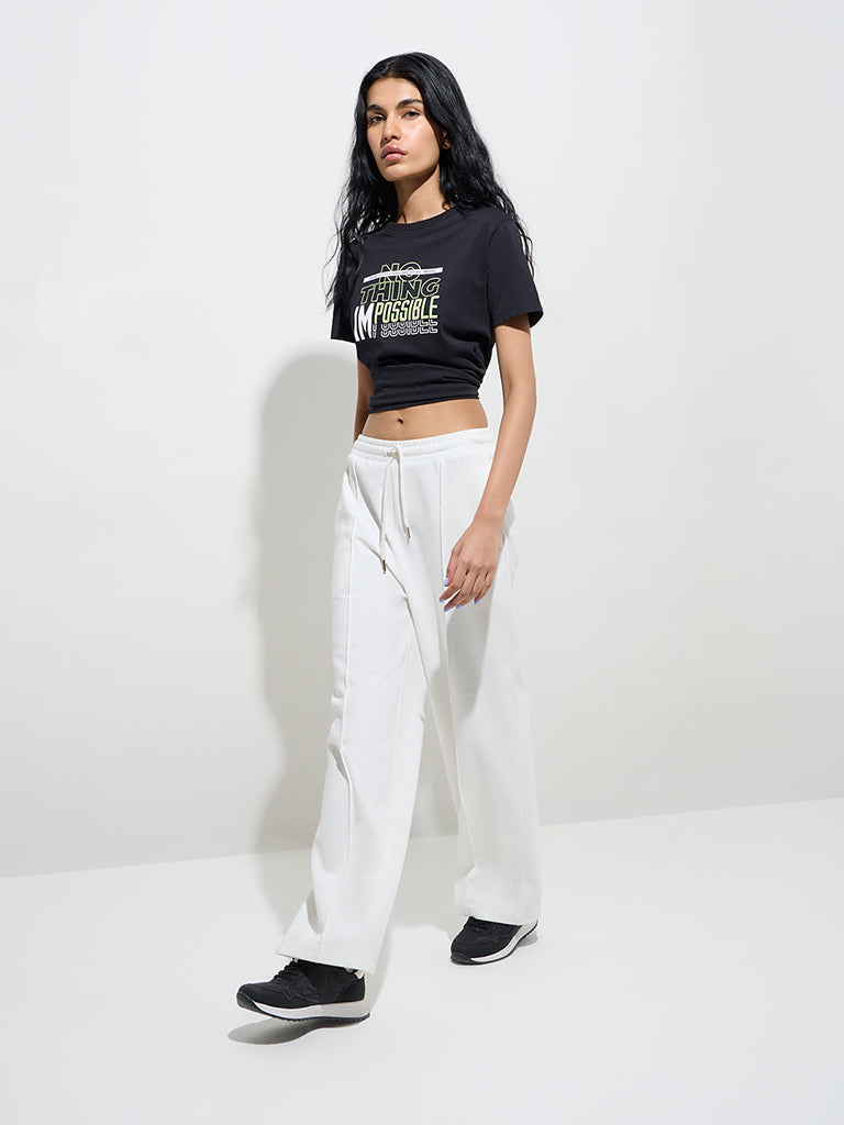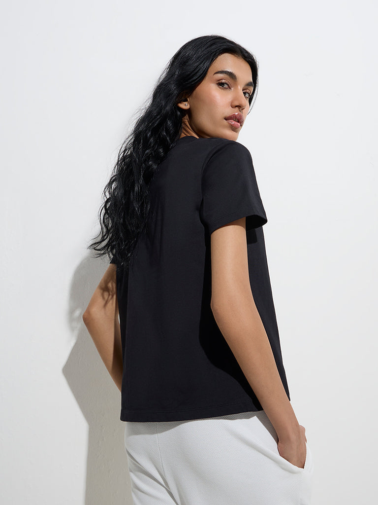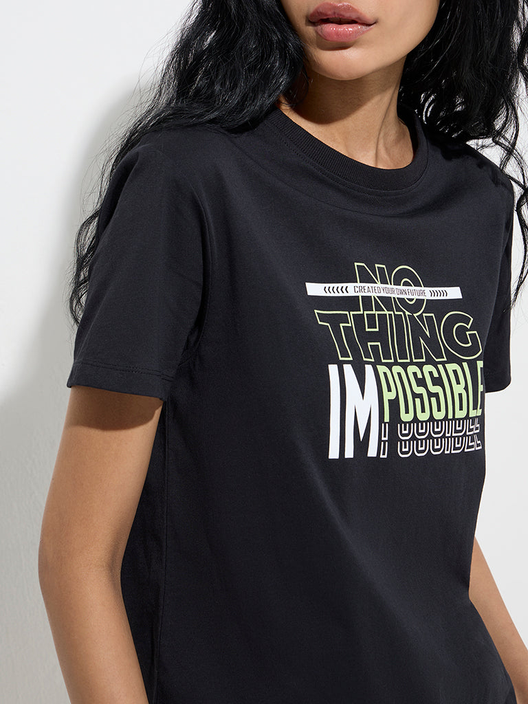 Add a bold touch to your casual wear with this black cotton T-shirt by Studiofit. featuring eye-catching text print for a trendy appeal. Designed for comfort. it comes with a ribbed round neck and half sleeves. making it a versatile staple for everyday style.