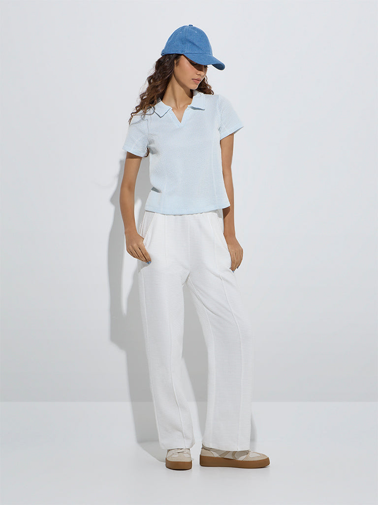 This blue polo t-shirt from Studiofit showcases textured stripes for dimension. Crafted from a cotton-blend fabric. it ensures comfort and breathability. Designed with a V-neck collar and short sleeves. it’s an easy-going piece for your casual wardrobe.