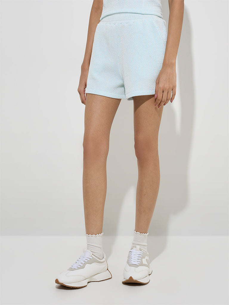 These blue high-rise shorts from Studiofit by Westside are made using a cotton-blend fabric accented with white textured stripes. Featuring an elasticated waistband for a secure fit and handy side pockets. they’re a stylish yet fuss-free choice for off-duty days.
