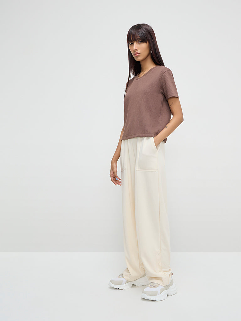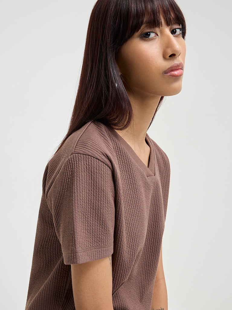 This brown top by Studiofit is designed with ribbed detailing. The quality fabric activewear includes a V-neck and short sleeves.