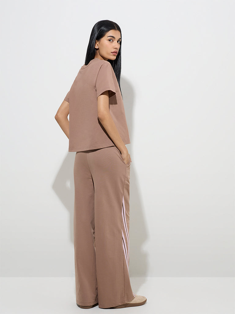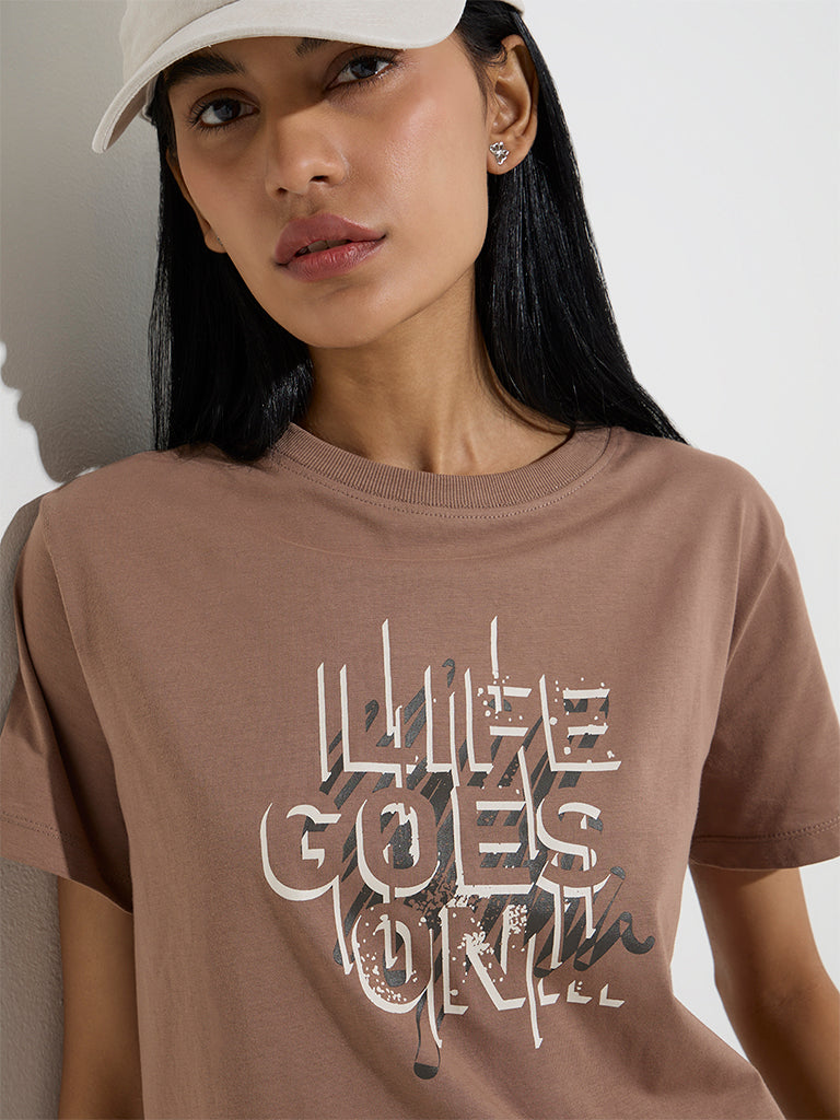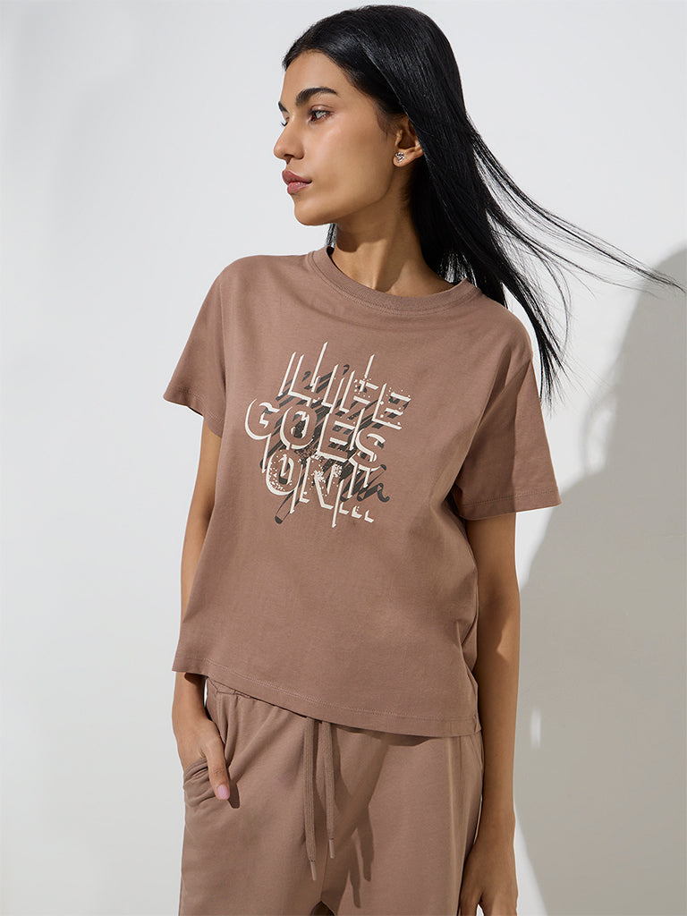 This brown t-shirt from Studiofit is designed with a round neck and half sleeves. Showcasing text prints at the front. it is crafted from a cotton-rich fabric. making it a reliable choice for active and casual wear alike.