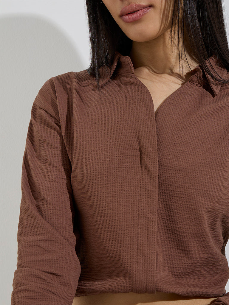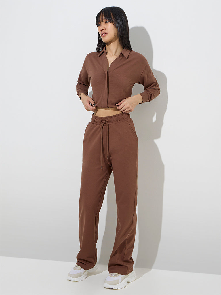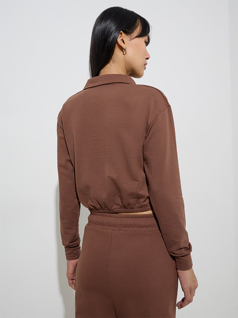 Get your hands on this brown top by Studiofit featuring textured detailing. The stylish activewear . made from a cotton-rich blend. carries a shirt collar and full sleeves. Its smooth elastic waistband ensures a secured fit.