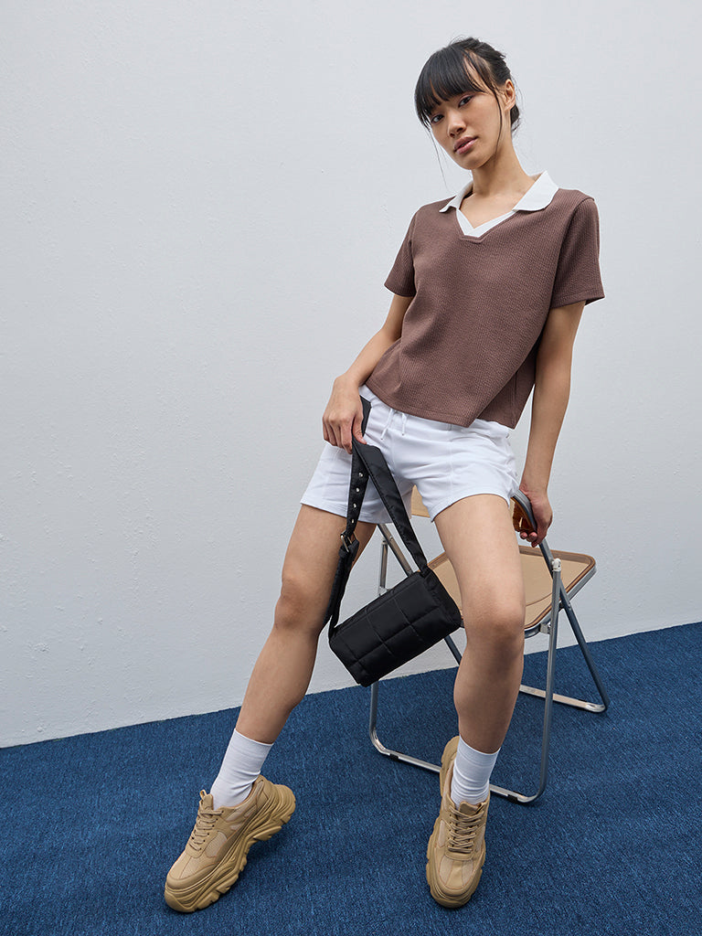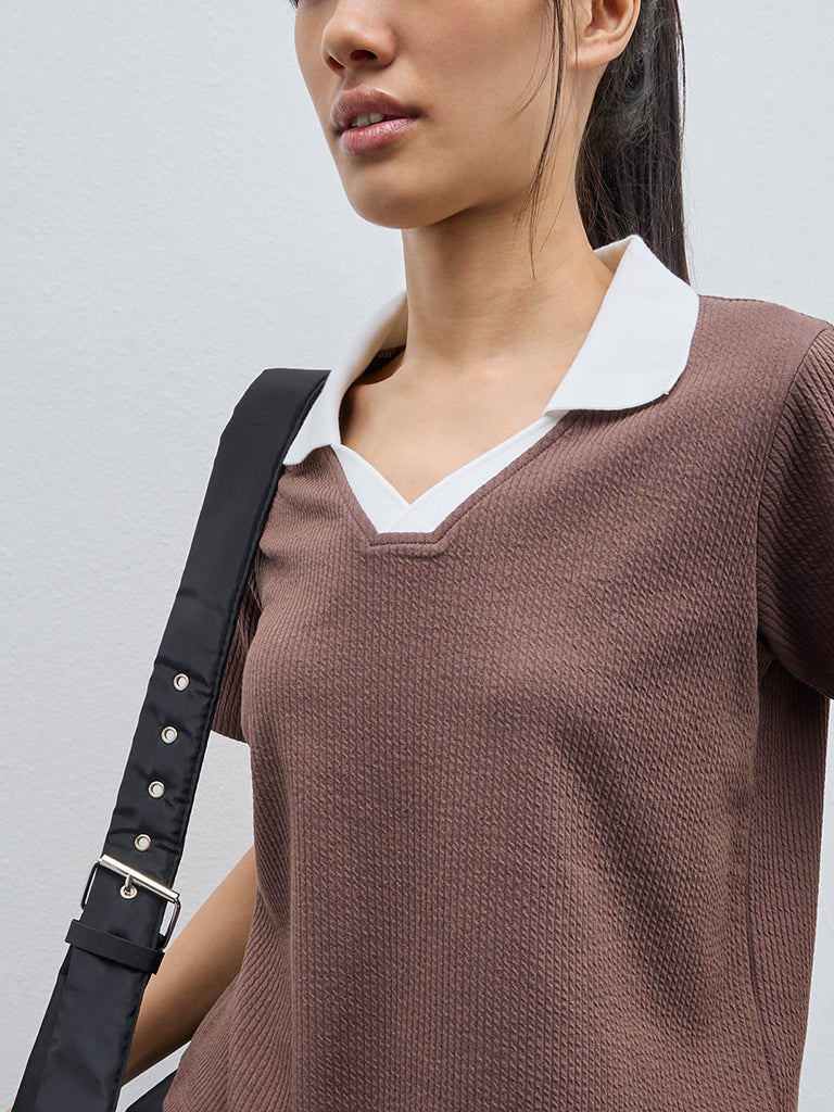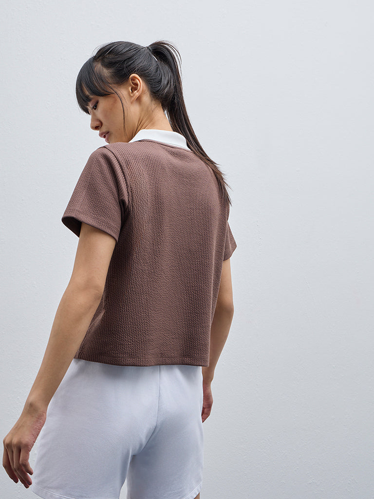This polo t-shirt by Studiofit flaunts a brown hue with textured stripes. Crafted from an elasticated cotton-blend fabric. this stylish tee is accentuated by a contrasting spread collar and short sleeves.