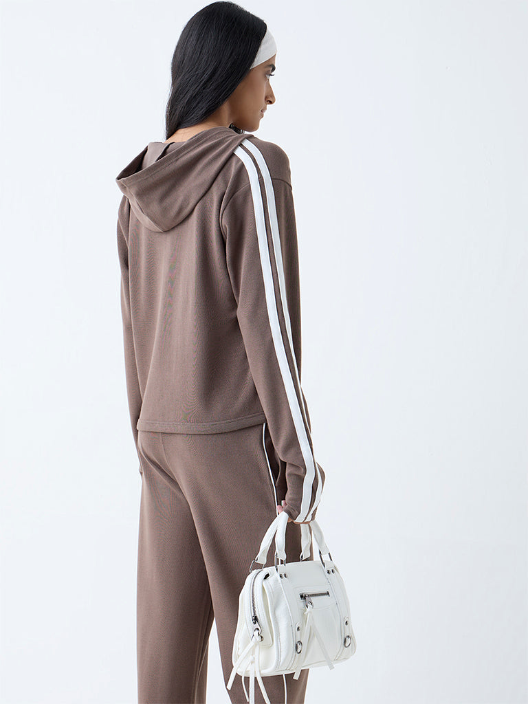This brown jacket from Studiofit blends style and performance with ease. Constructed from a breathable fabric. it flaunts dainty text prints on the front for a modern edge. The hood flows into a sleek zipper placket. while the striped full sleeves add a sporty touch.