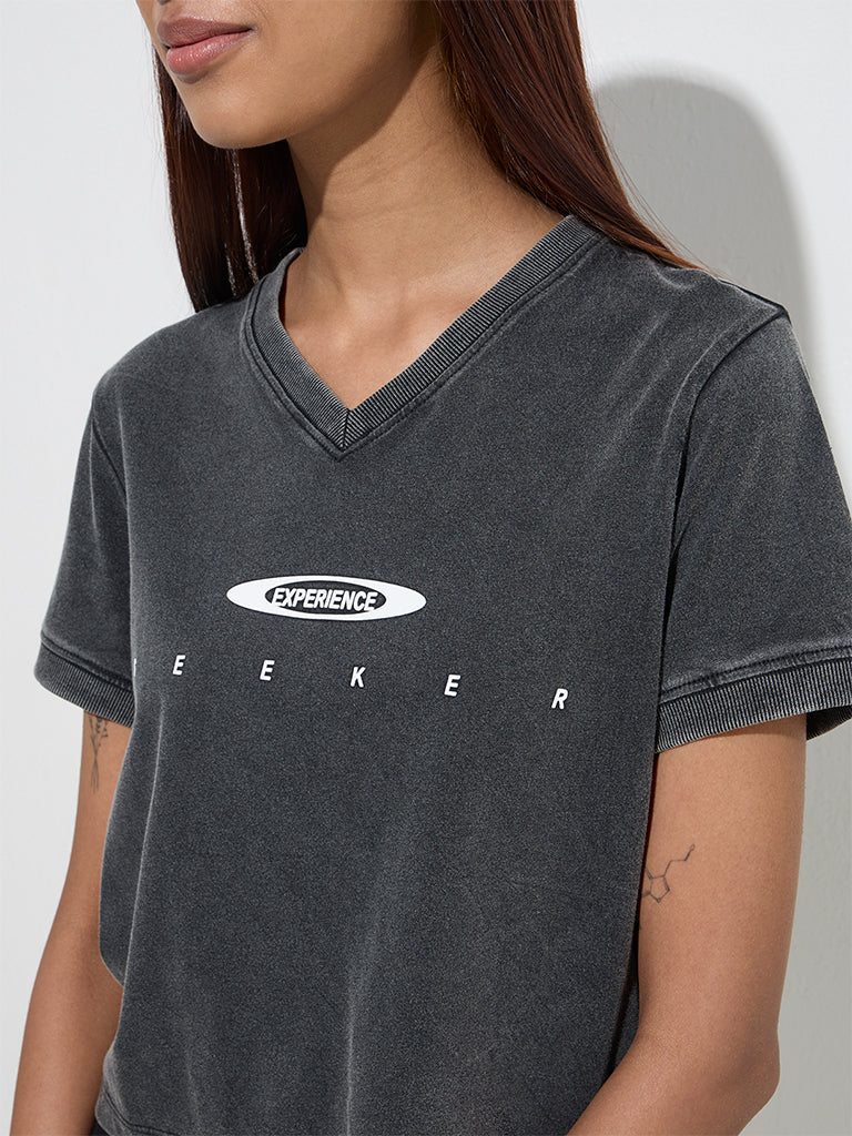 Studiofit Charcoal Text Printed Cotton T-Shirt