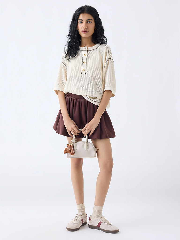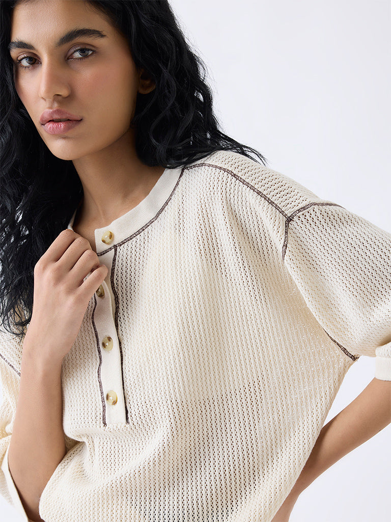 Active mornings and laid-back evenings call for this cream t-shirt from Studiofit. Cut from pure cotton with a crochet-inspired texture. it keeps things breathable while adding subtle dimension. A round neck with a short button placket brings structure. while dropped sleeves relax the fit for easy movement.