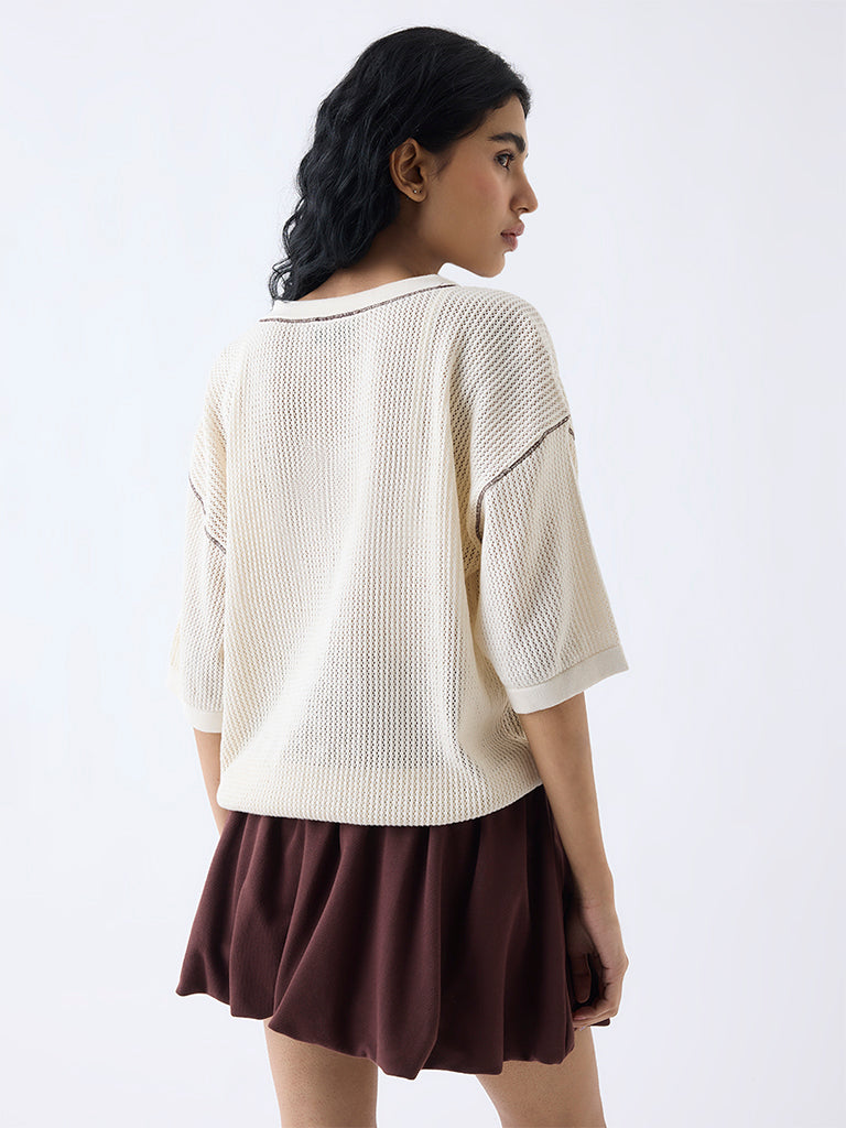 Studiofit Cream Crochet Detailed Cotton T-Shirt