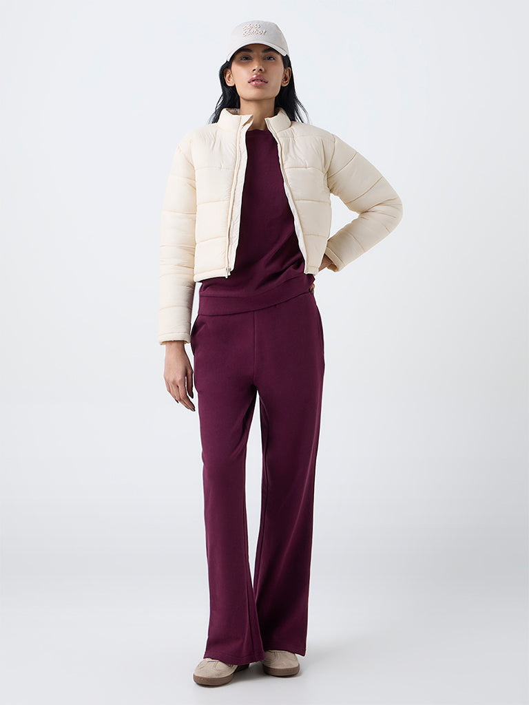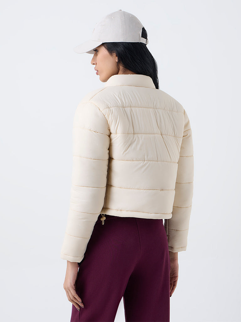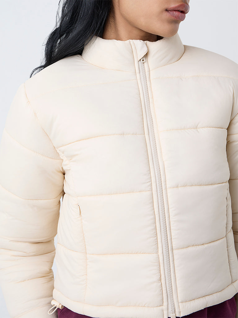 Refresh your winter rotation with this cream puffer jacket from Studiofit. crafted to deliver lightweight warmth for active days. The smooth quilted finish keeps the silhouette streamlined. while the premium-blend fabric offers comfort without bulk. A high mock neck. full sleeves and a clean front zipper enhance coverage. and the zippered side pockets secure essentials on the move.