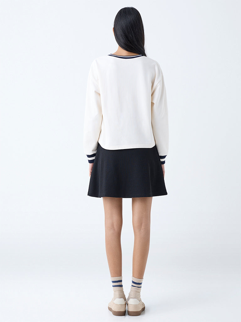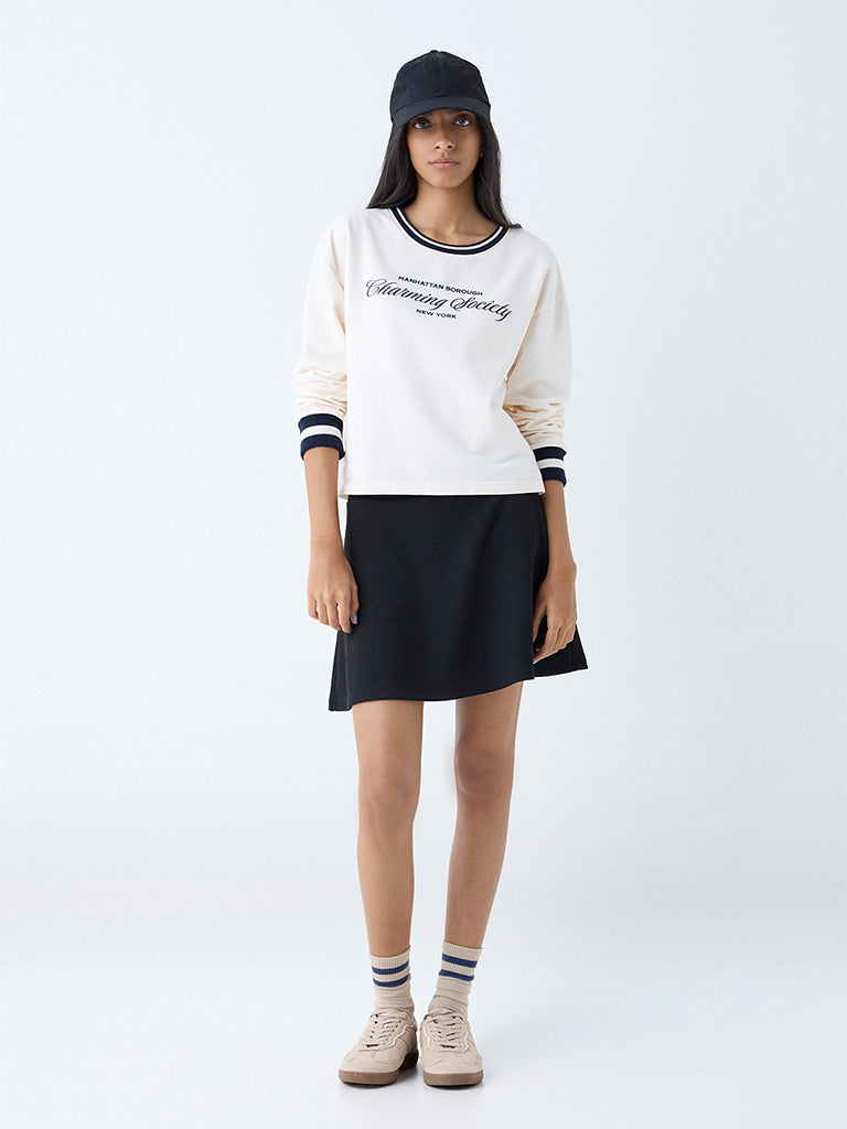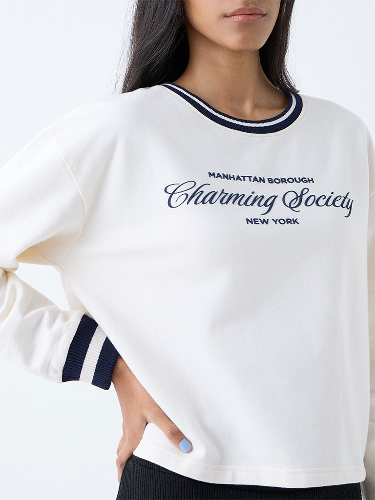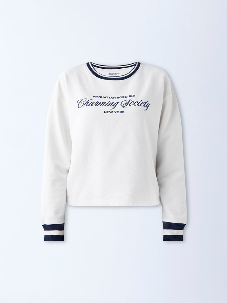 Studiofit Cream Text Detailed Cotton Sweatshirt