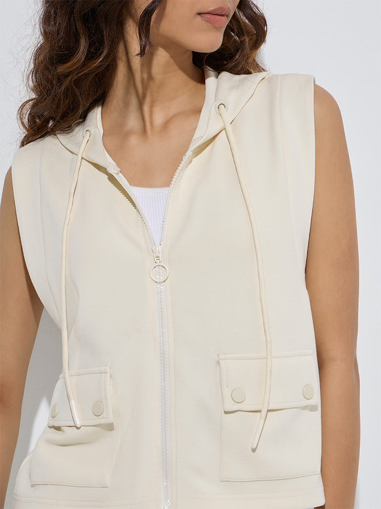 Layer up in style with this cream vest jacket from Studiofit. Designed for off-duty comfort. it features a sleeveless cut. zip-up front. and an attached hood with adjustable drawstrings. The soft fabric and dual front pockets add functionality. making it an easy pick for casual outings or workout sessions.
