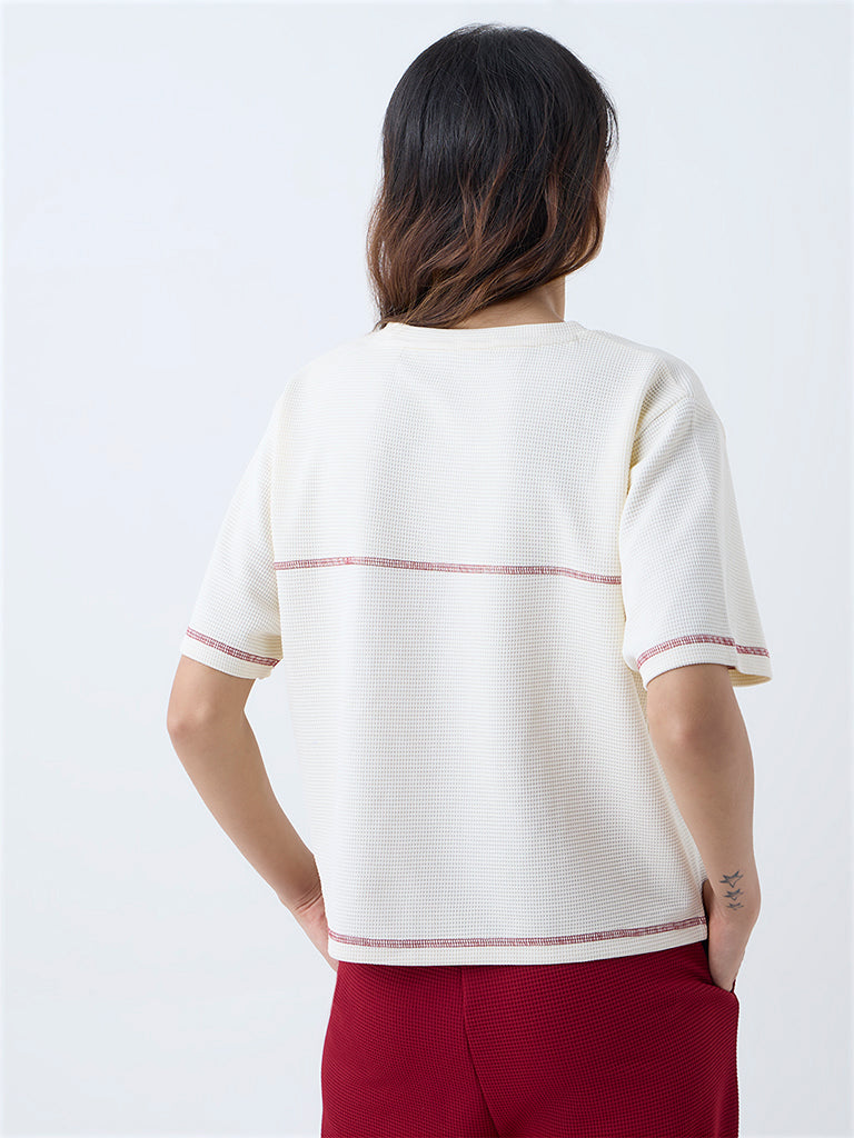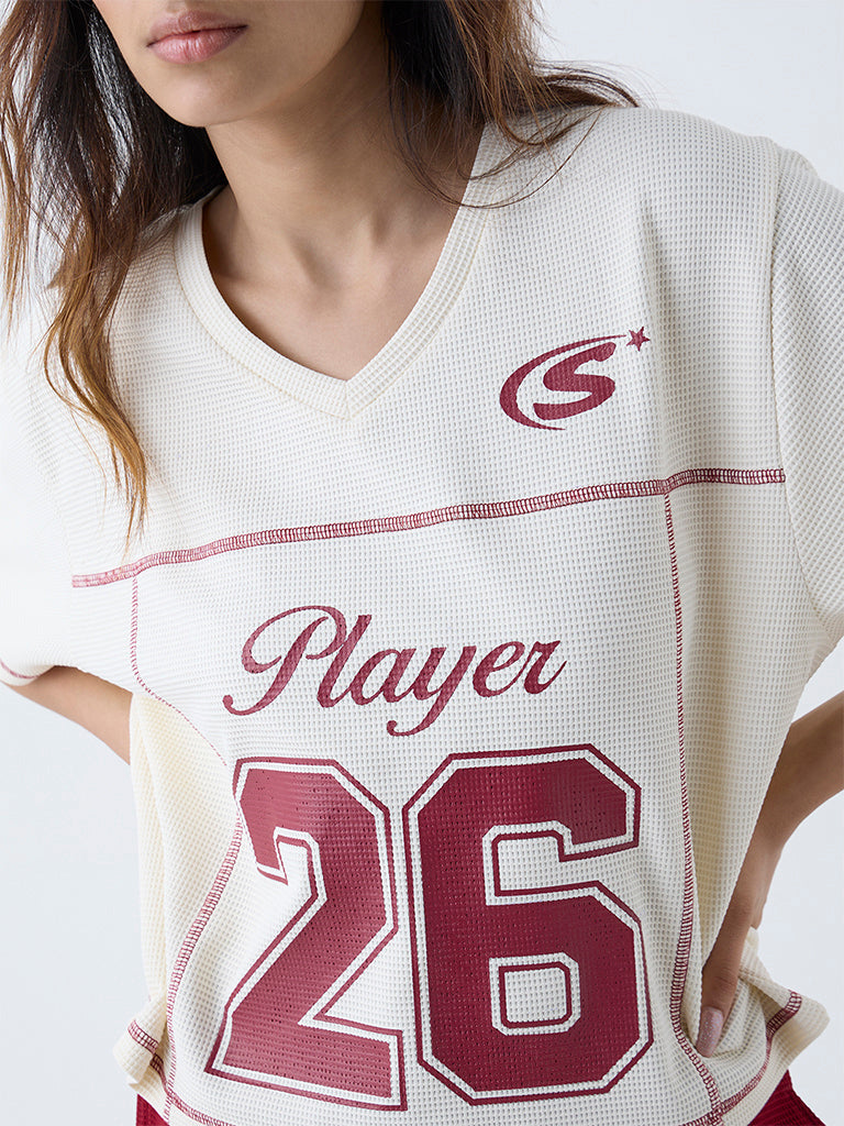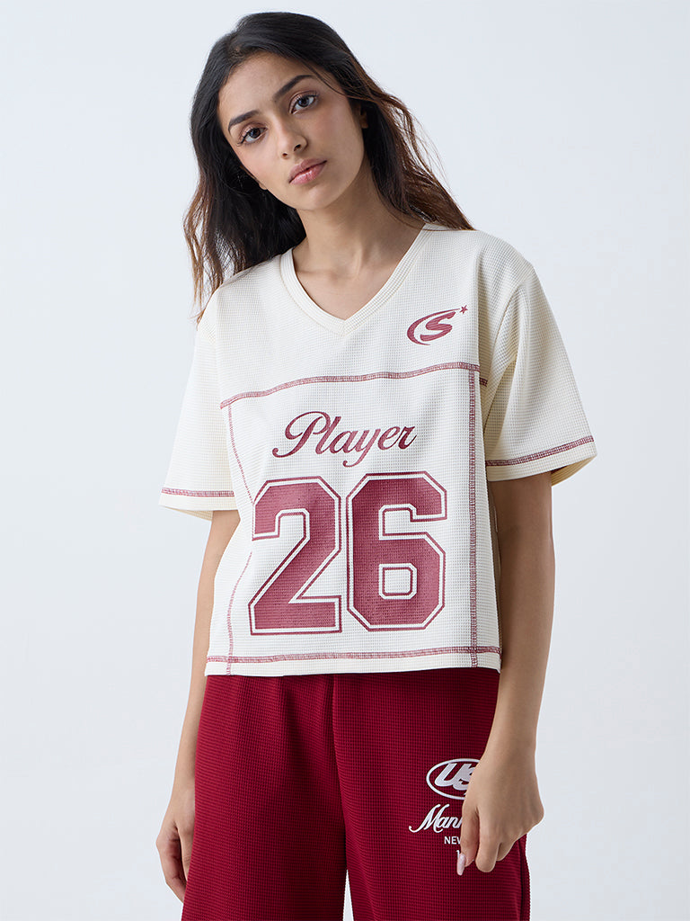 Studiofit introduces this cream t-shirt built from soft. lightweight fabric. featuring a waffle-textured profile. Exhibiting striking numerical prints and text motifs. it is framed with a V-neck and short sleeves. A versatile pick for workouts and casual athleisure.