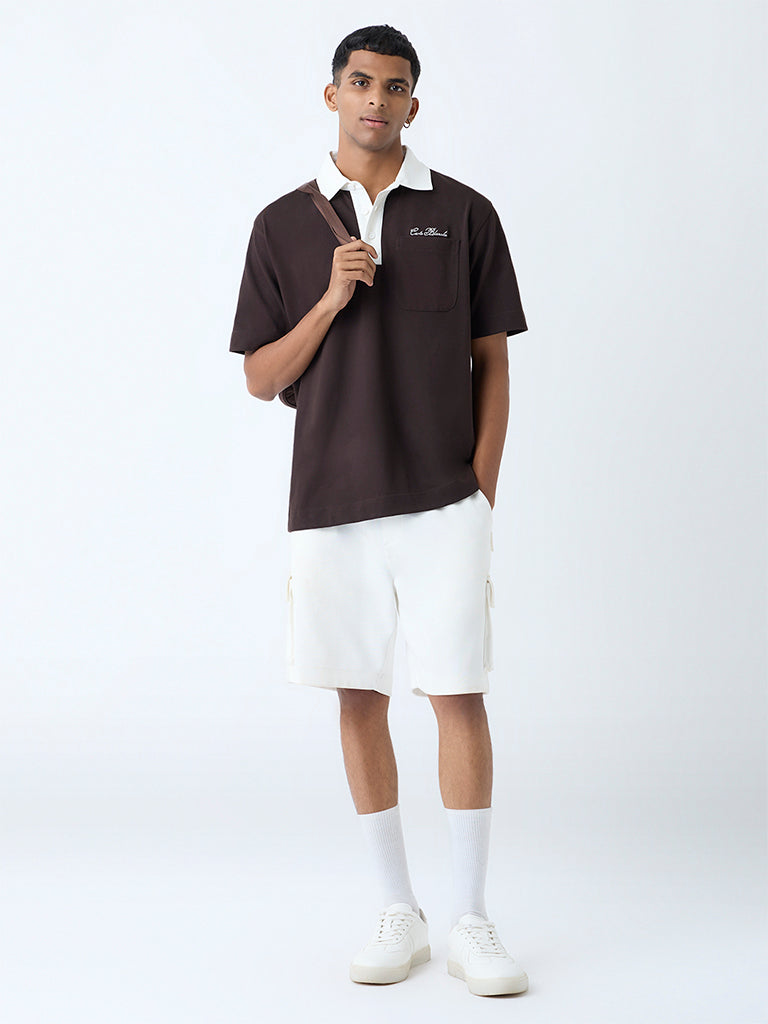 Make a statement in motion with this dark brown polo t-shirt from Studiofit. featuring stylised text prints over a chest pocket for a contemporary edge. Crafted from a breathable fabric. it offers all-day comfort and ease of movement. A classic collar. three-button placket. and short sleeves complete this versatile piece.