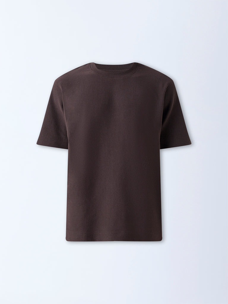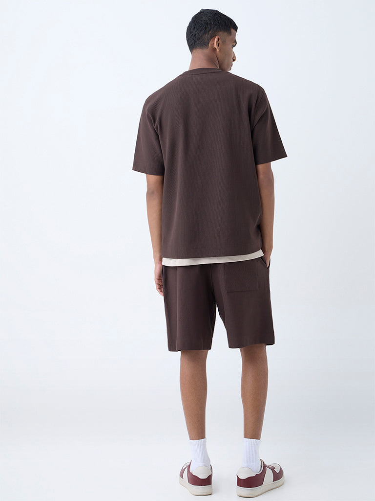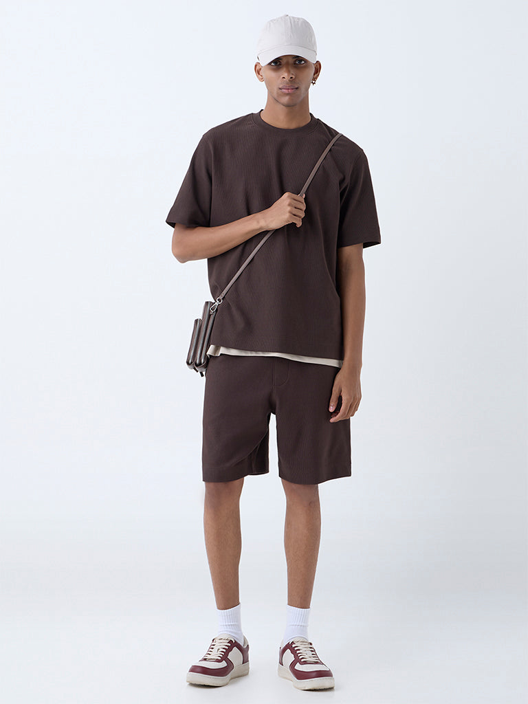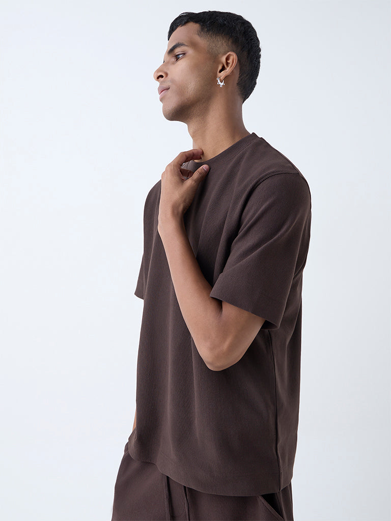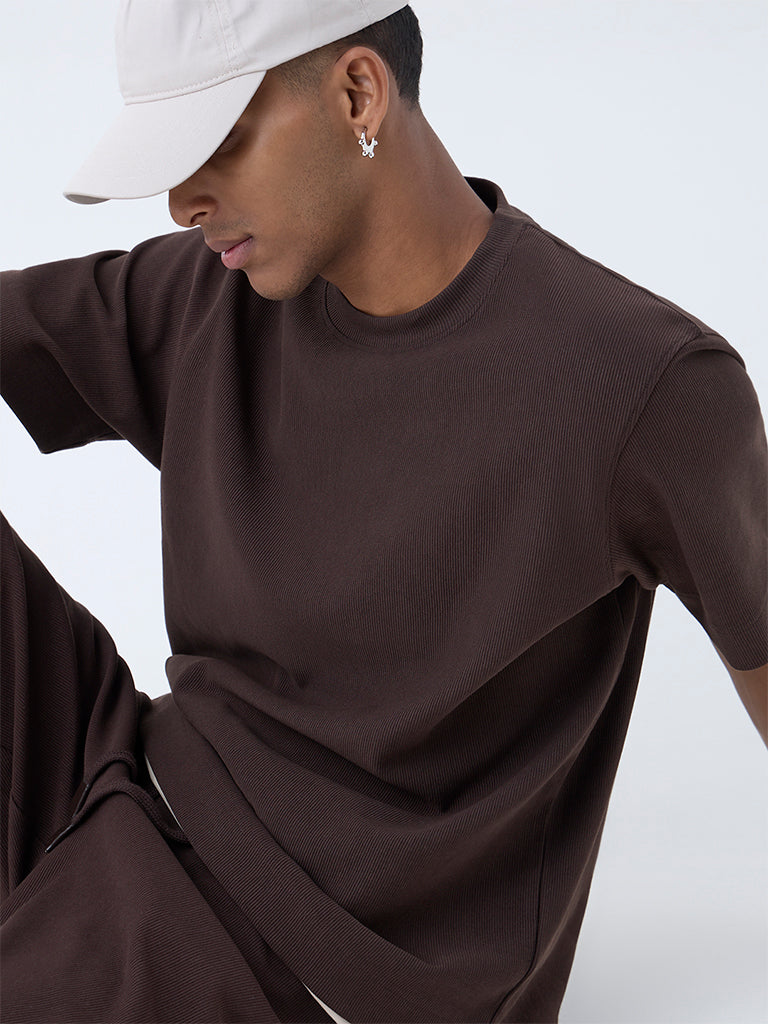 Own your training days with this dark brown t-shirt from Studiofit. woven from a ribbed-textured fabric that delivers a tactile edge and lasting comfort. Its relaxed cut pairs with a defined crew neck and short sleeves. making it a versatile layer for warm-ups. cooldowns. and everything in between.