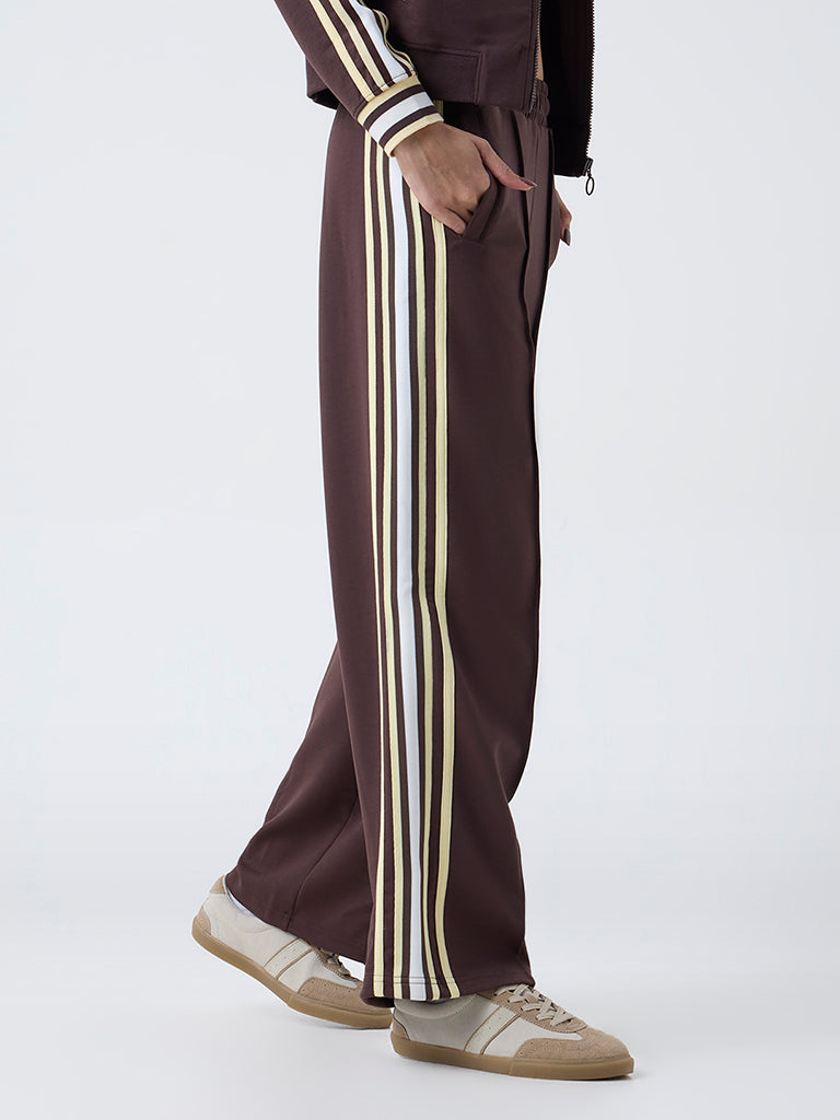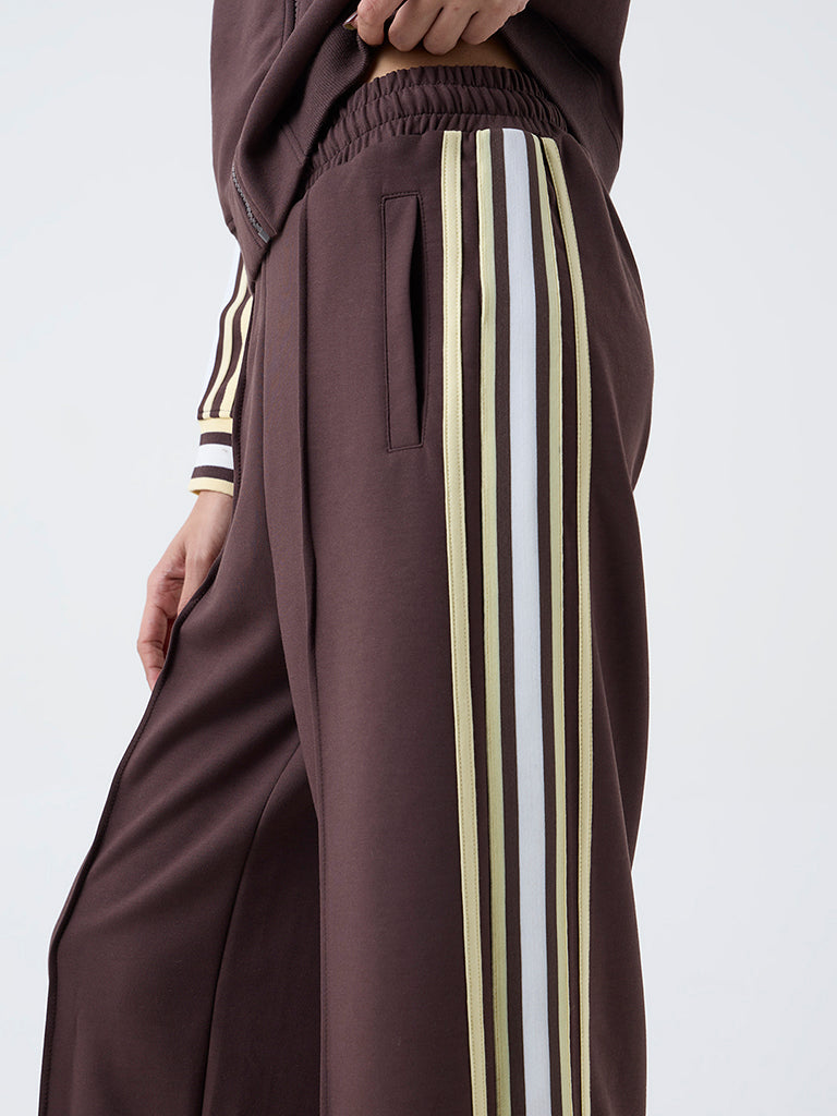 Add a sporty-chic lift to your rotation with these dark brown side-stripe pants from Studiofit. Crafted from stretchable fabric for maximum comfort. they’re designed with an elasticated waistband and handy side pockets for everyday ease. The sleek stripe detailing brings that signature athletic flair.