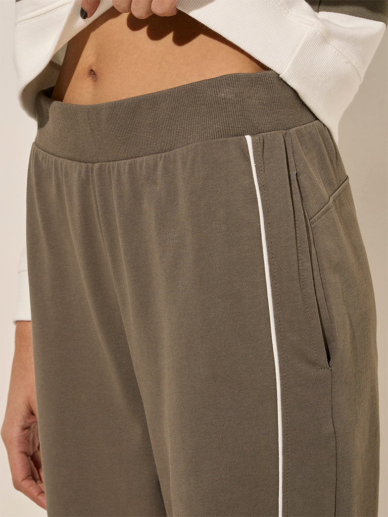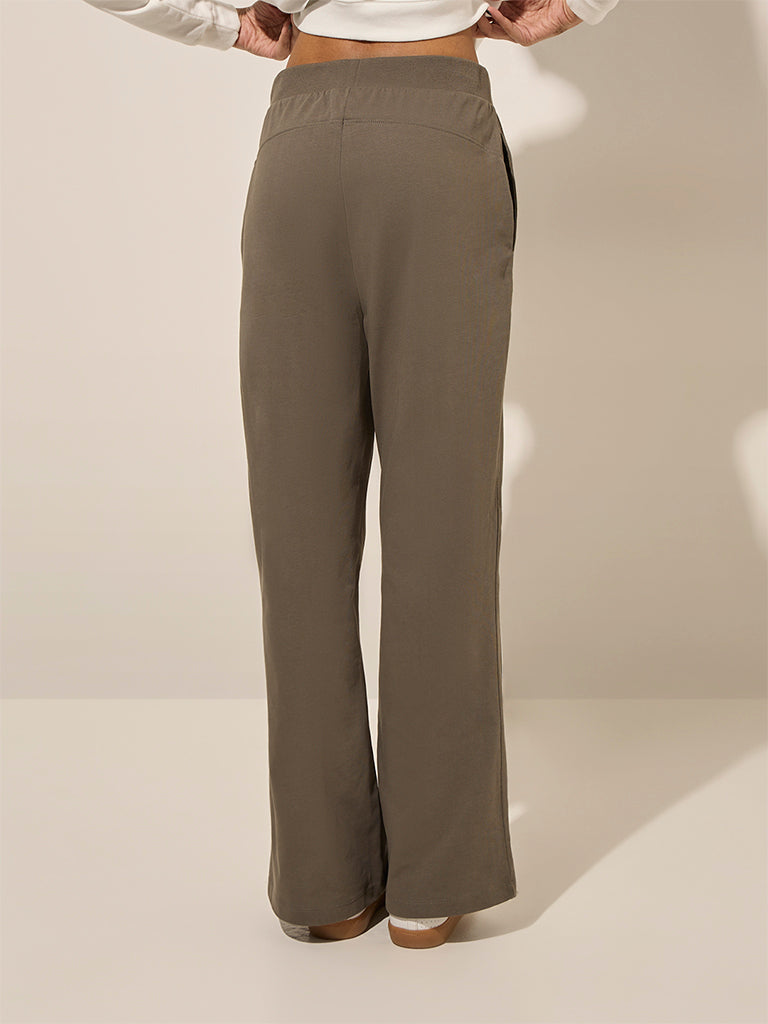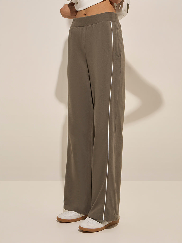 Studiofit introduces these dusty olive track pants. crafted from a lightweight fabric for ultimate comfort. Designed with a high-rise fit. they feature seam detailing and an elasticated waistband for a snug fit. The functional side pockets add practicality.