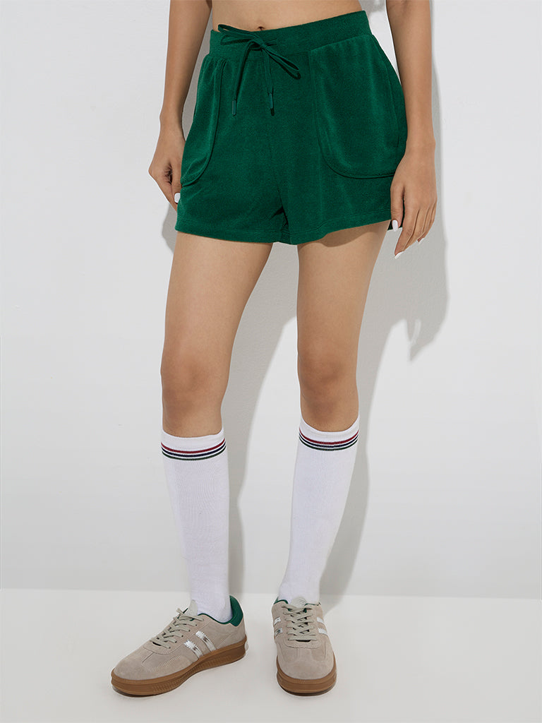 Studiofit launches these green shorts crafted from soft fleece cotton-blend fabric. Designed with a smooth elastic waist with adjustable drawstrings and functional pockets. this high-rise pair is ideal for everyday wear or active routines.