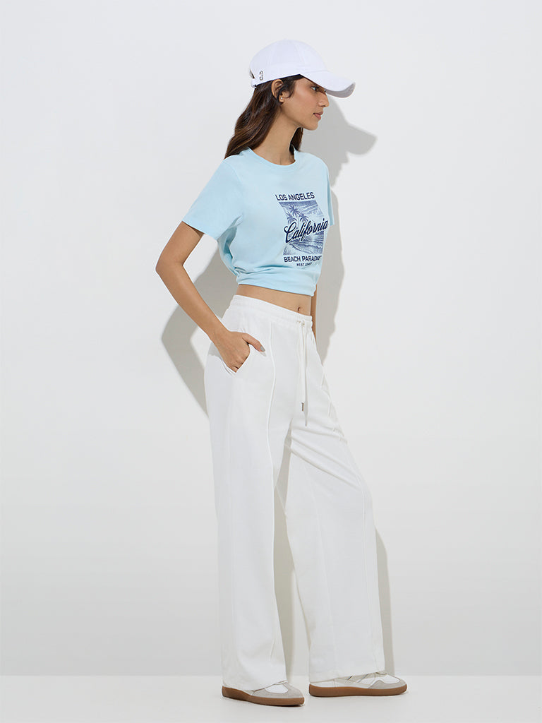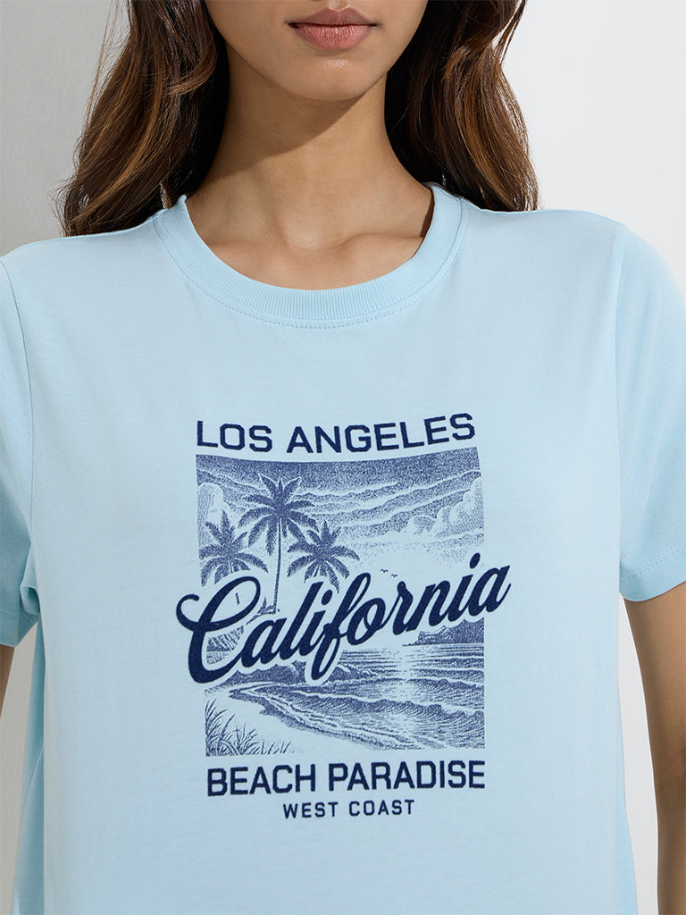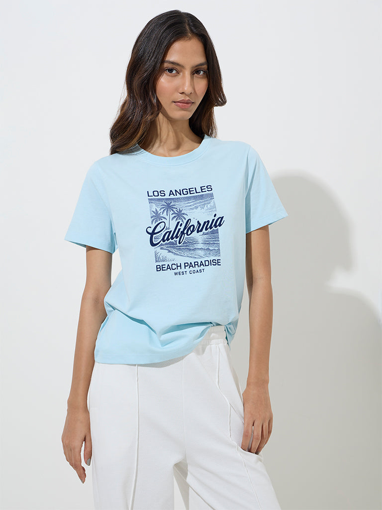 Studiofit Light Blue Text Pattern Cotton T-Shirt