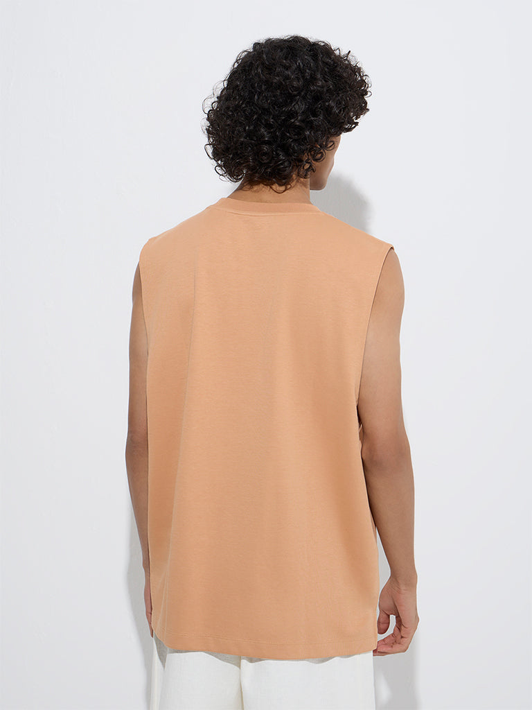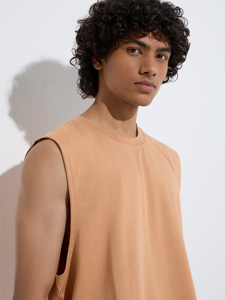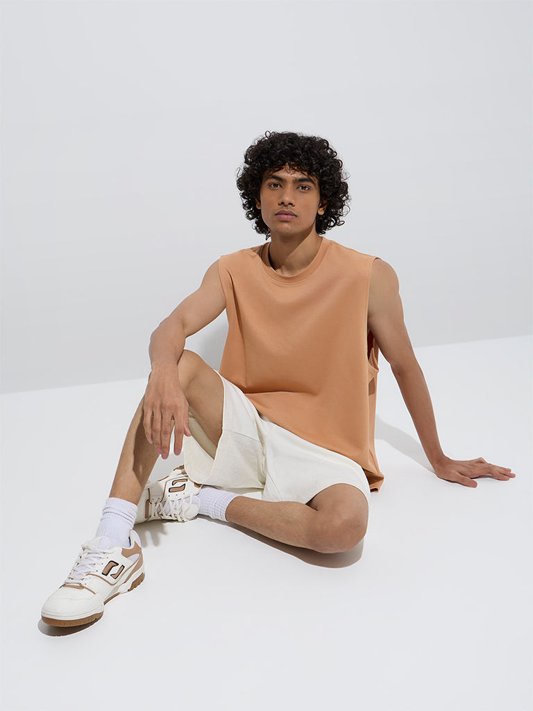 Studiofit brings you this light orange t-shirt crafted in a relaxed fit for a laid-back vibe. Made from a rich cotton-blend fabric. it features a classic round neck and a sleeveless cut. making it a bold and versatile choice for casual outings or workout days.