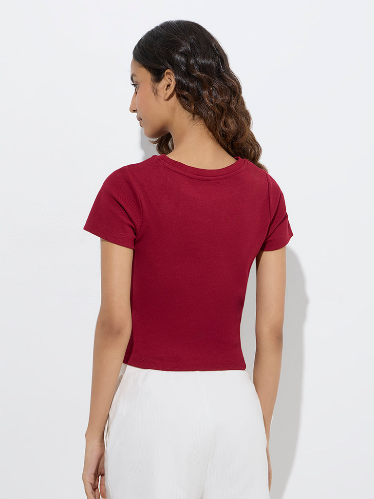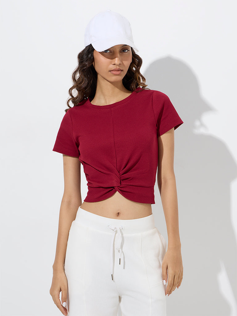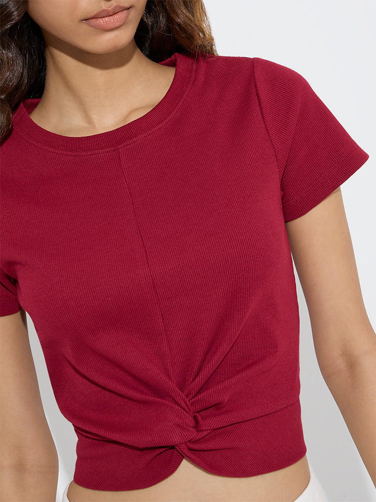 Studiofit introduces this maroon t-shirt made from a cotton-blend fabric with a cozy ribbed texture for all-day comfort. Designed with a round neck and short sleeves. it offers a comfortable fit with a stylish knot detail at the front.