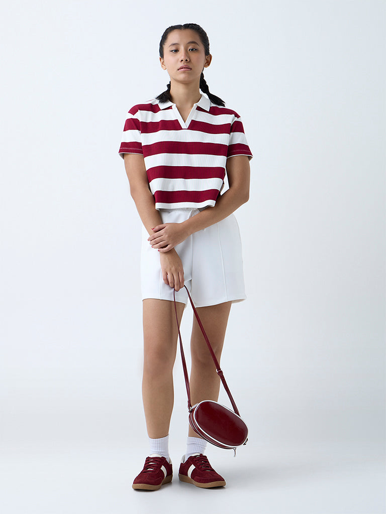 Built for movement. this maroon t-shirt by Studiofit is a versatile addition to your activewear line-up. Fashioned with stripes and a ribbed texture. it’s crafted from a cotton-blend fabric for ultimate comfort. The V-neck collar and half sleeves complete the look with an athletic finish.