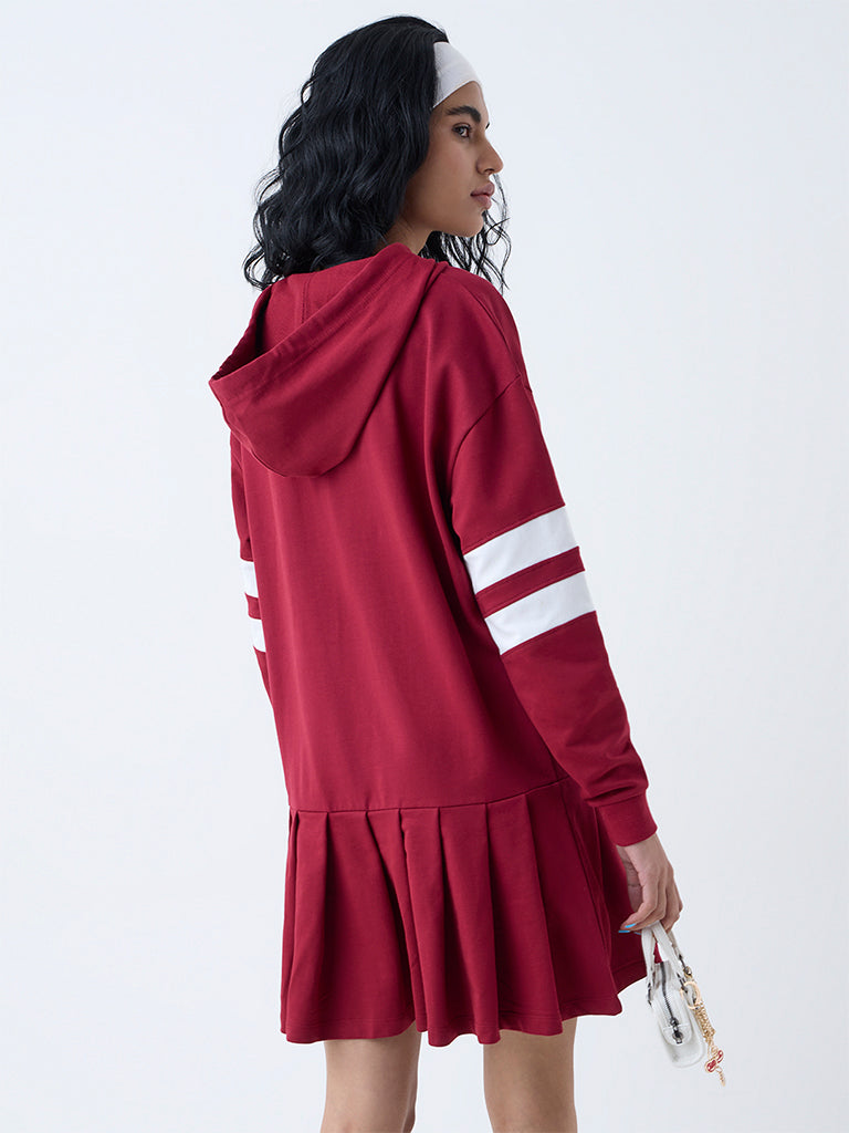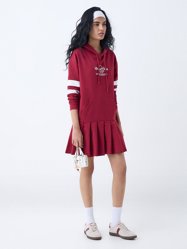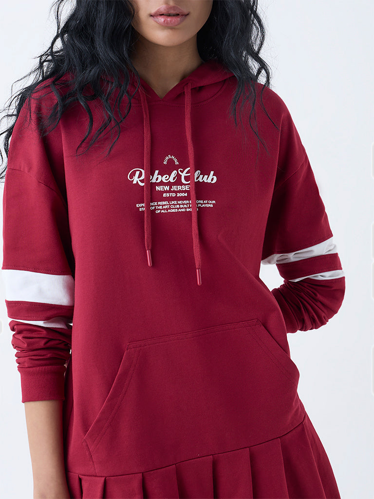 Chic style takes centre stage in this maroon dress from Studiofit. fashioned with bold text prints across the front. The drop-waist silhouette features a hooded neck with drawstrings and full sleeves. while box pleats add playful movement. Finished with kangaroo pockets. it blends sporty energy with everyday ease.