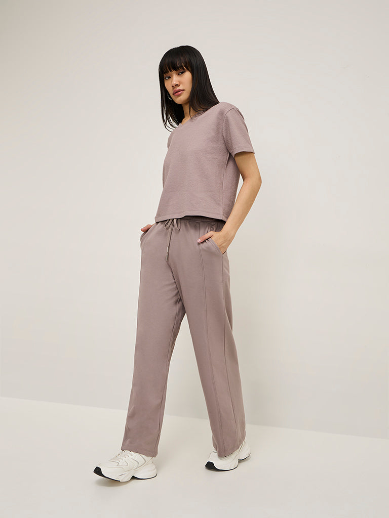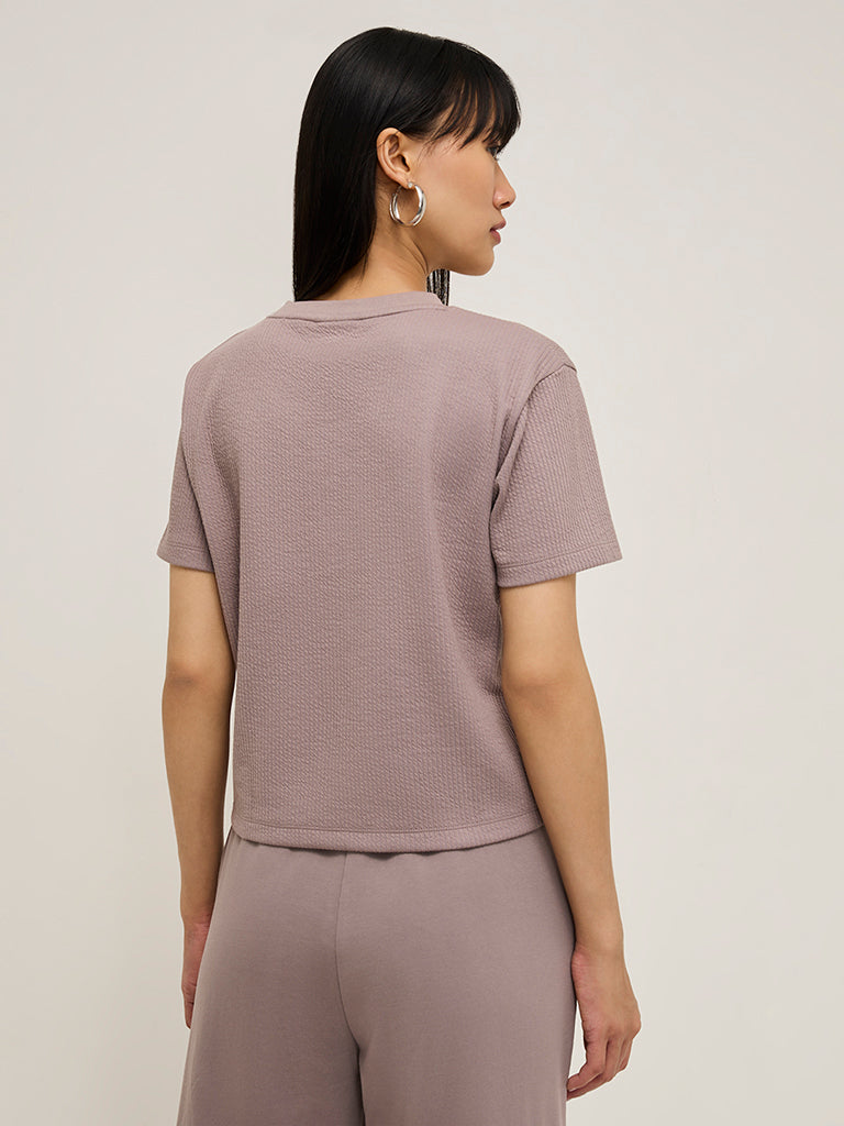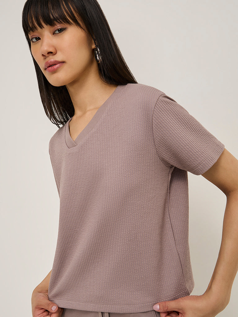 This mauve t-shirt from Studiofit showcases self-striped designs. Its breathable composition ensures all-day comfort. who the V-neck and short sleeves complete it.