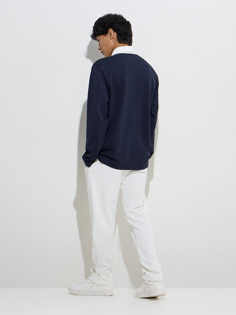 Studiofit presents this navy relaxed-fit sweatshirt. enhanced with stylish text embroidery for a modern touch. Crafted from a rich cotton blend. it features a contrasting white spread collar with a secure two-button placket and full sleeves. making it a versatile addition to your casual wardrobe.
