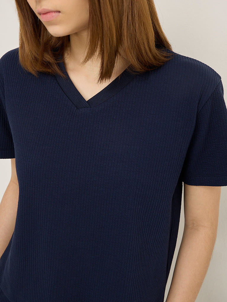 This navy t-shirt by Studiofit showcases seersucker stripes. It is made from a lightweight material with a V-neck and short sleeves.