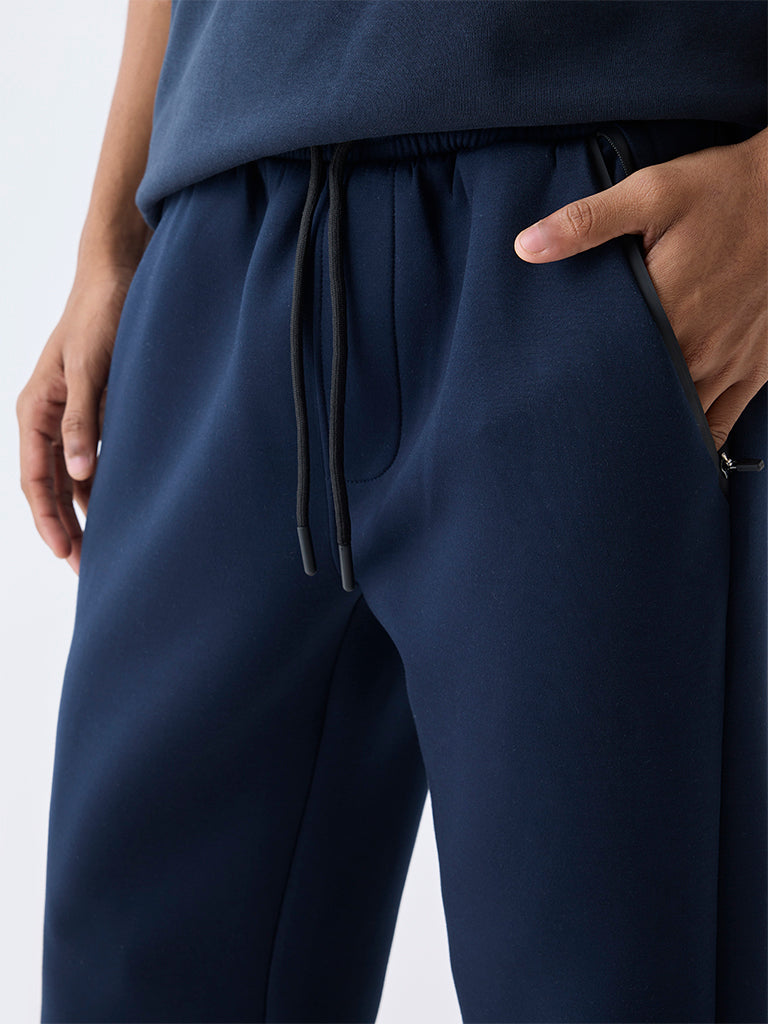 Stay agile on the move in these navy active track pants from Studiofit. Designed in a tapered silhouette with flexible stretch. they’re finished with an elastic waist. drawstring ties. and zip pockets—bringing together function and sharp style for urban routines and beyond.