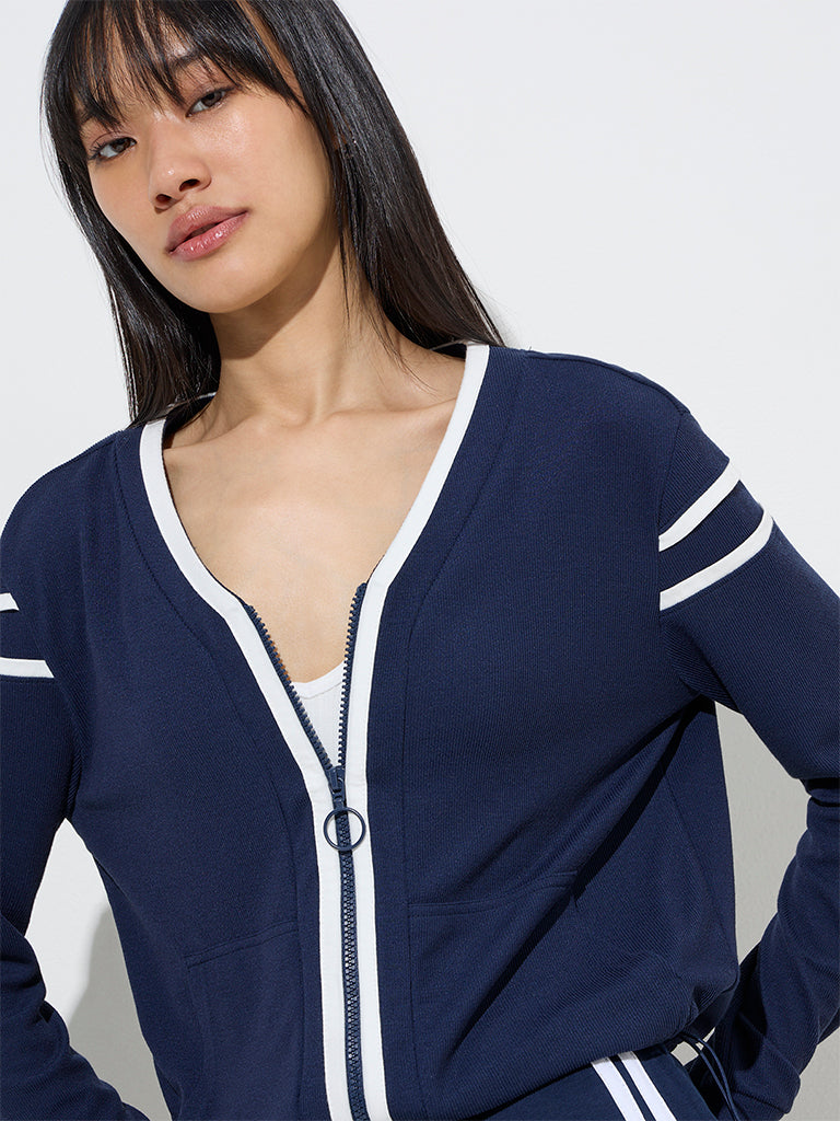 This navy jacket by Studiofit features striking white stripes detailing. The soft and breathable fabric garment carries a round neck. full sleeves. and side pockets.