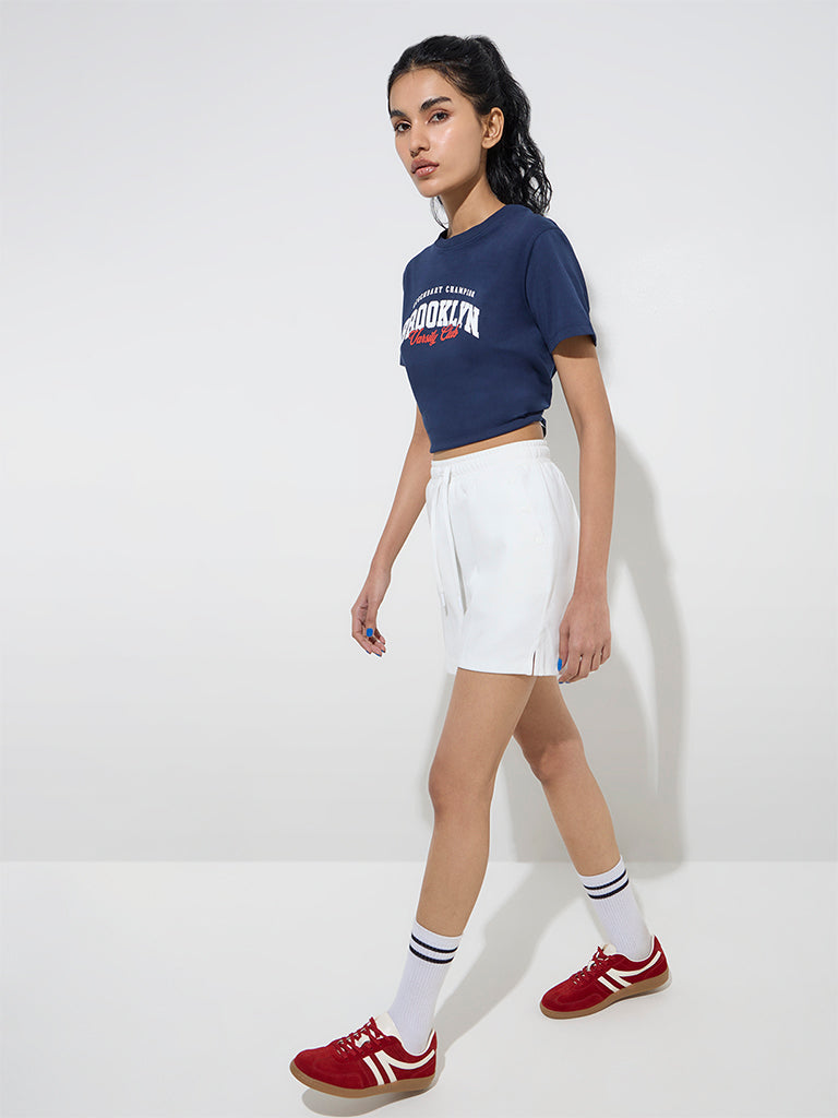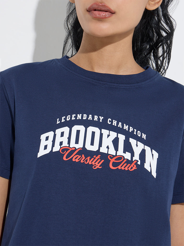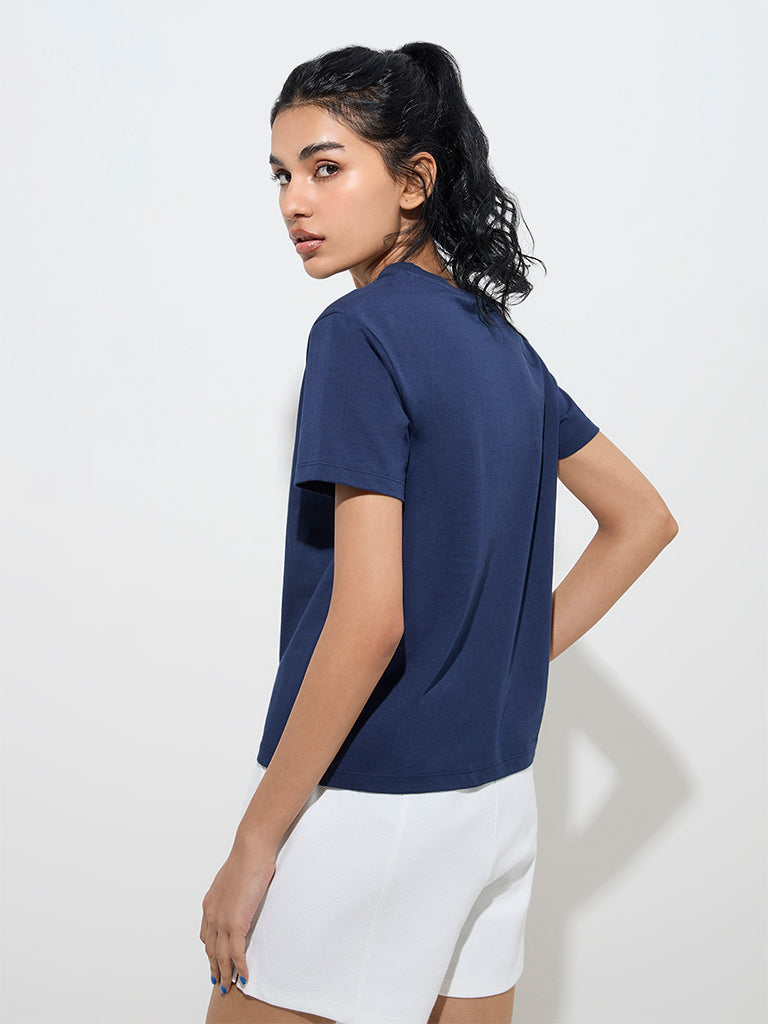 Studiofit Navy Text Printed Cotton-Blend T-Shirt
