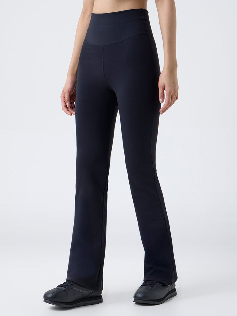 Studiofit Nuoflexx refines activewear staples with these black pants designed for ease and flexibility. Crafted from a lightweight and stretch fabric. they contour smoothly to the body while allowing unrestricted movement. The high-rise elastic waistband offers secure comfort and support and the flared legs create a clean. lengthened silhouette.