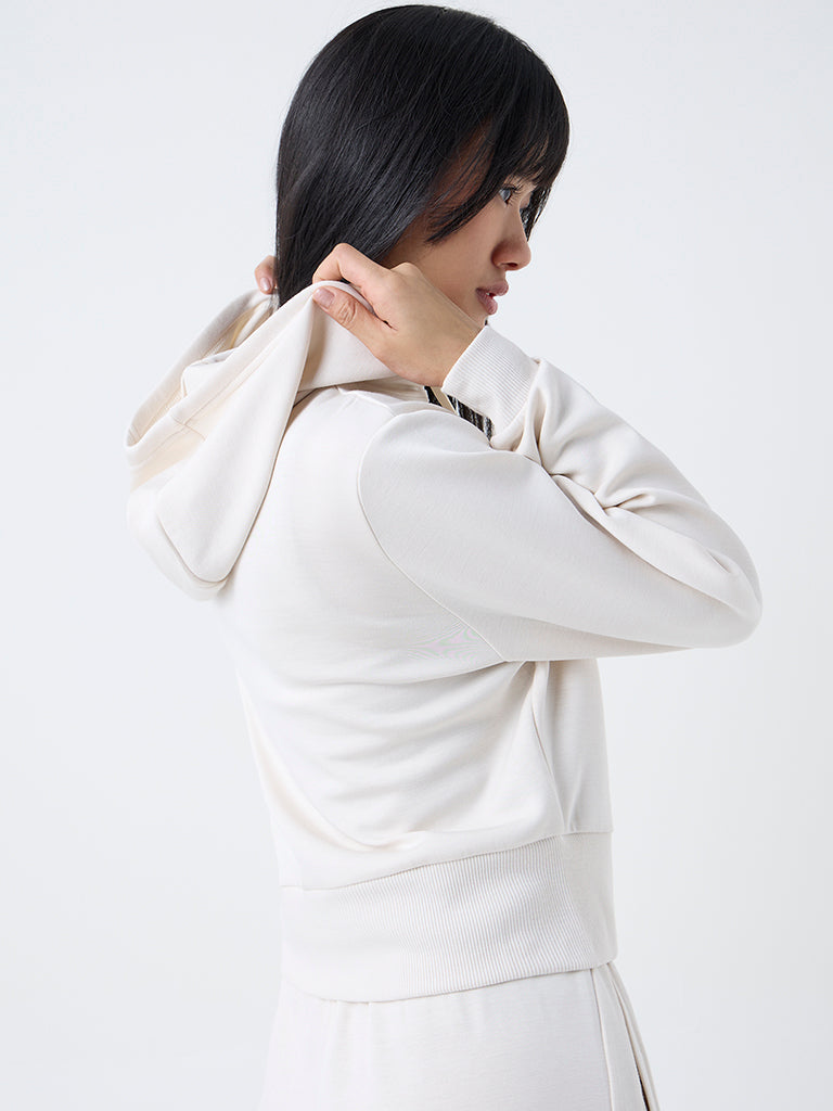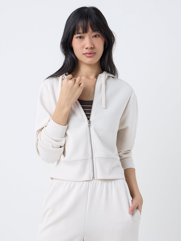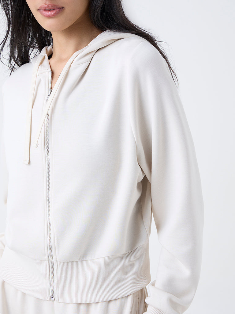 Effortless and easy. this cream jacket from Studiofit Nuoflexx is designed for everyday comfort. Crafted from sumptuous fabric blend. it is framed with a hood with drawstring detail. zip-up front and full sleeves for a balanced mix of function and ease. Ribbed trims lend shape to the relaxed silhouette. while the minimal design keeps it versatile for layering across casual edits.
