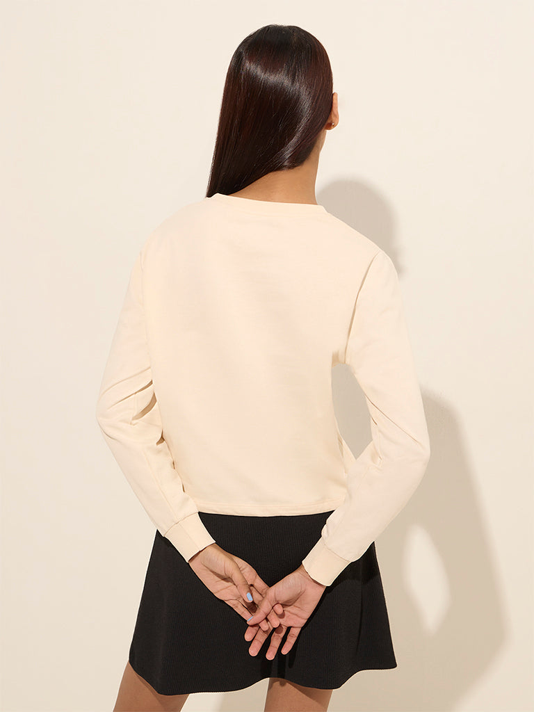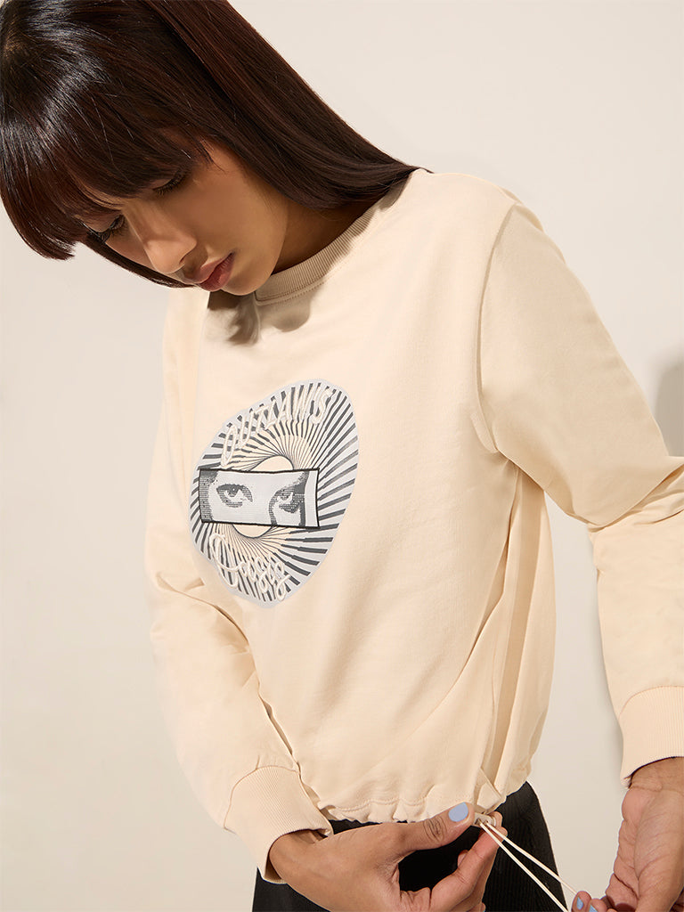 This off-white sweatshirt by Studiofit is spun from a cotton-rich fabric for uninterrupted comfort. Showcasing printed designs. it includes a ribbed crewneck and full sleeves. The adjustable drawstrings at the hem ensure a flattering fit.