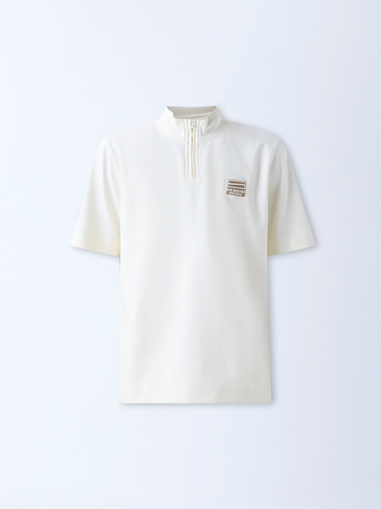 This off-white t-shirt from Studiofit is tailored in a relaxed fit to allow easy movement through the day. Accented with a logo-base motif across the chest. it features a mock neck and short sleeves for a clean. sporty look. Made from lightweight fabric. it ensures breathable comfort for both workouts and laid-back moments.