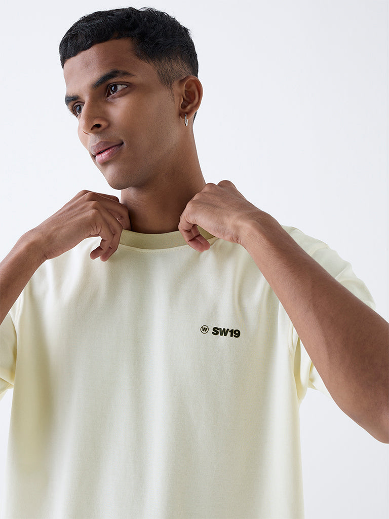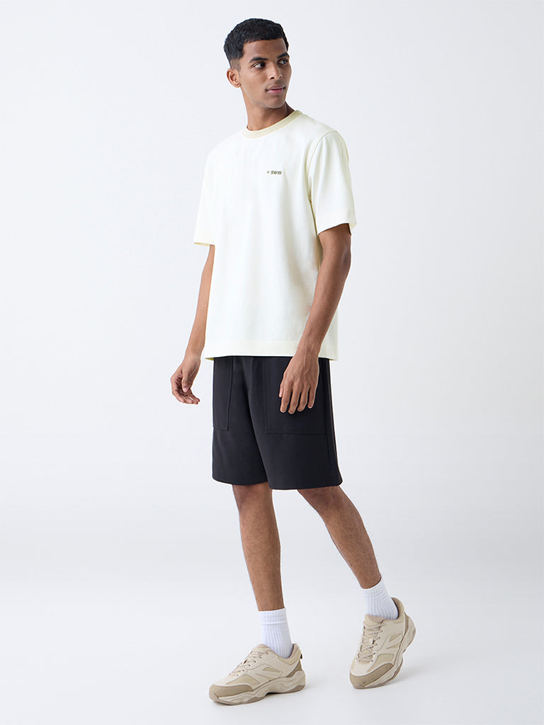 A Studiofit essential. this off-white t-shirt is designed to move with you. Cut from a soft cotton-blend fabric. it ensures day-long comfort while its relaxed silhouette keeps the look effortlessly cool. The round neck and short sleeves make it a classic foundation. while text motifs add a subtle statement. Ideal for workouts. weekend downtime. or layering under casual edits. it’s a go-to piece for the modern active wardrobe.