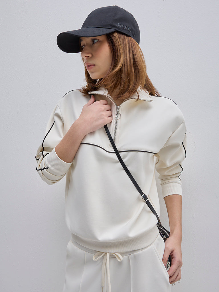 Studiofit presents this off-white sweatshirt in seam-detailing. Crafted with quality fabric. the activewear boasts a stylish high neck leading to a brief zipline and full sleeves.