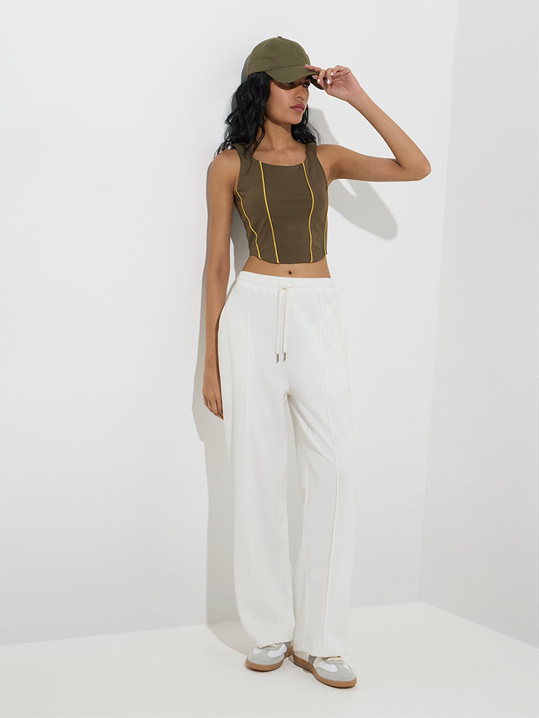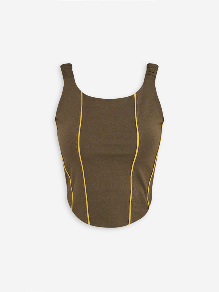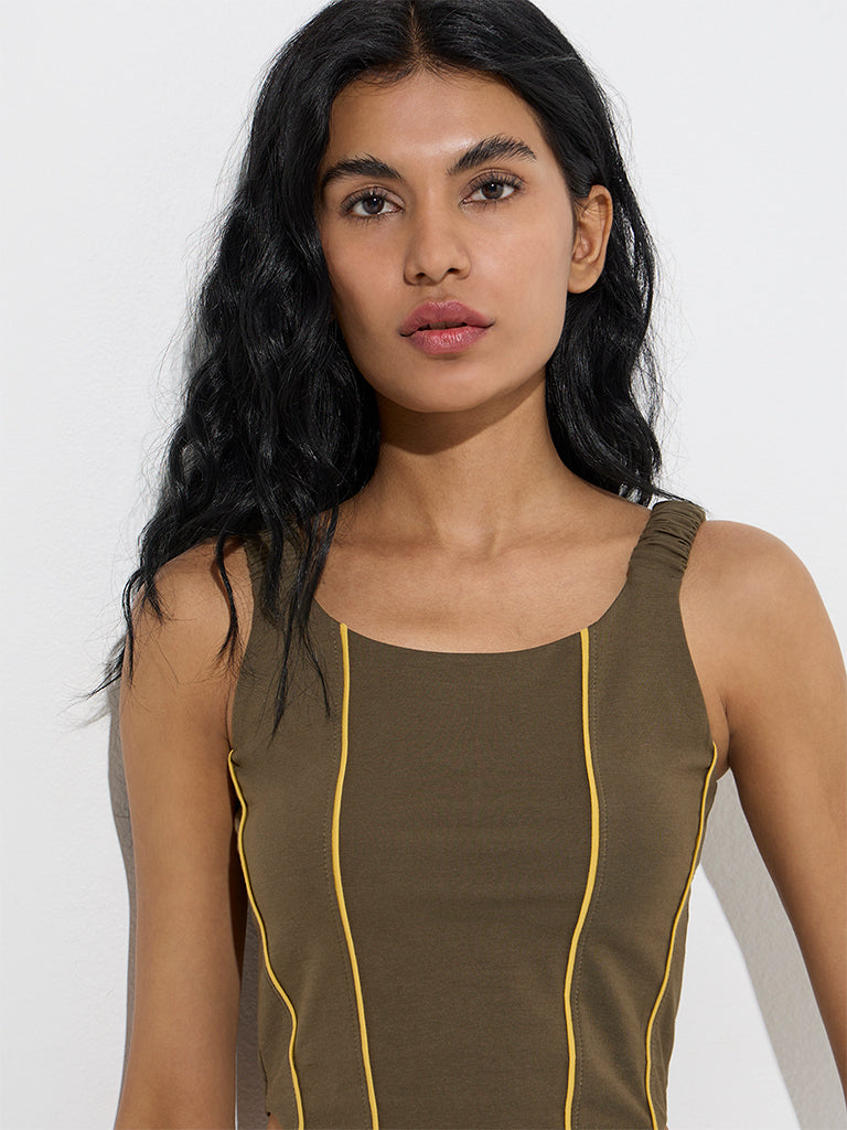 This olive top from Studiofit fuses sporty edge with a flattering silhouette. Designed with contrast piping and a corset-inspired cut. it sculpts the frame while offering all-day comfort. Spun from a rich cotton-blend fabric. it’s detailed with a round neck. ruched shoulder straps. and a smocked back for ease and flexibility.