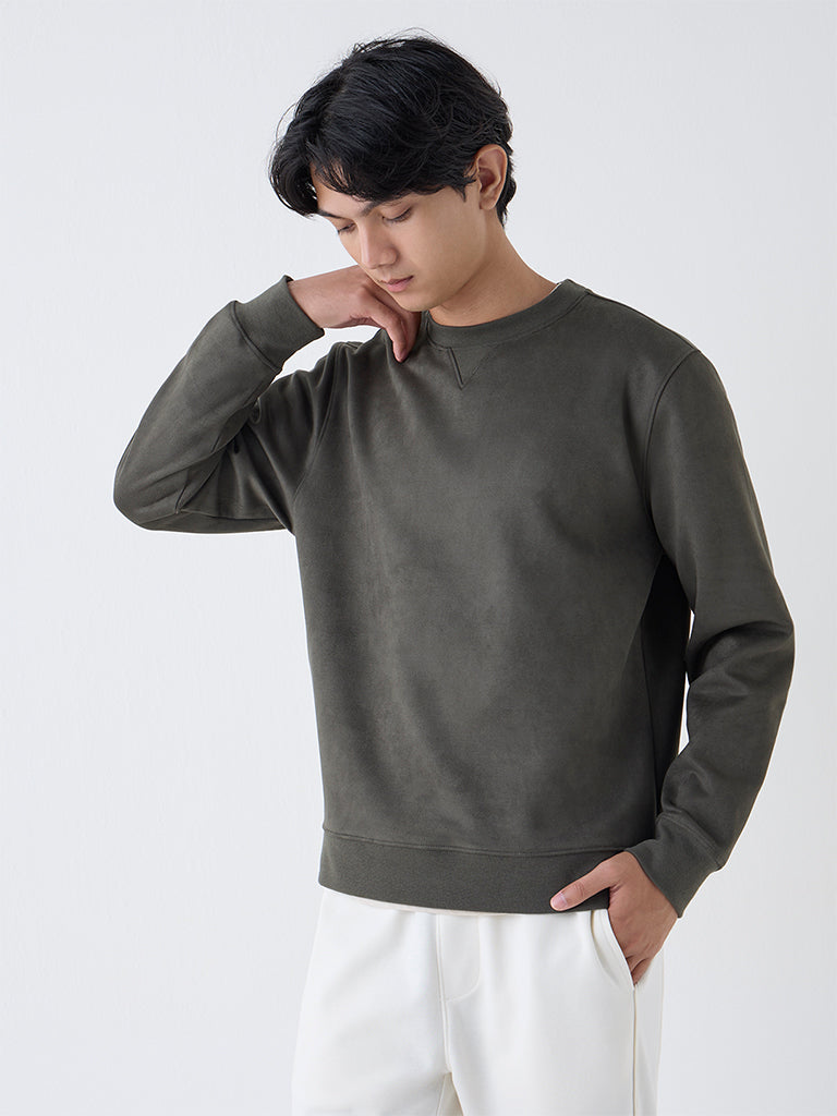 Studiofit Olive Solid Relaxed-Fit Suede Sweatshirt